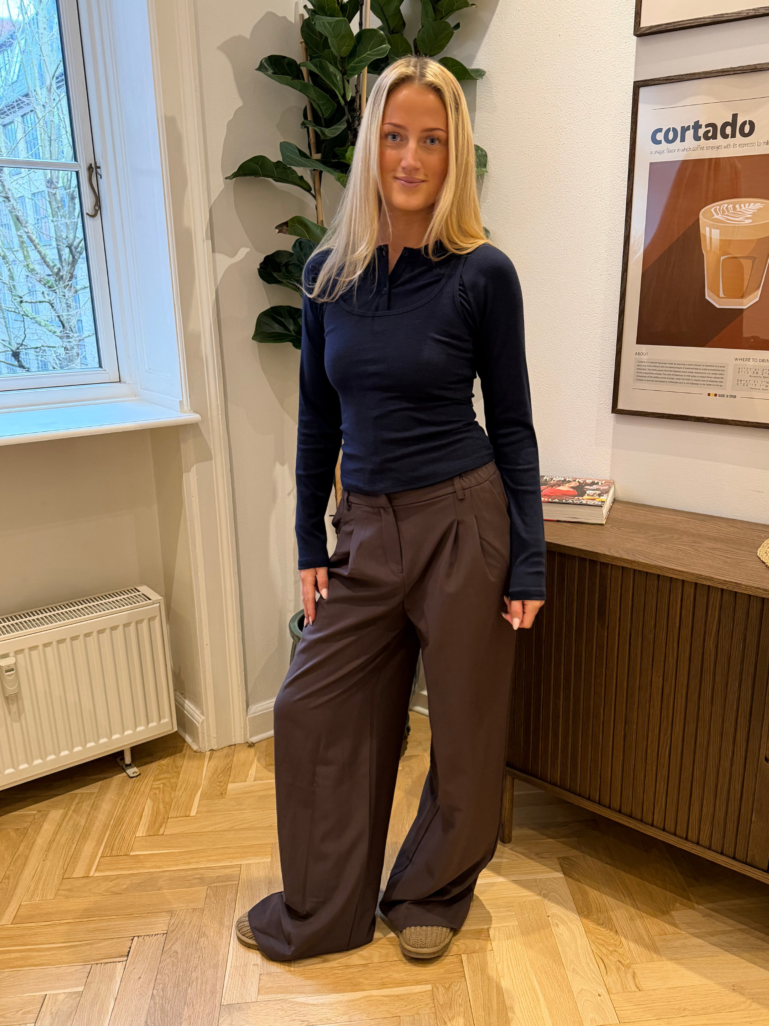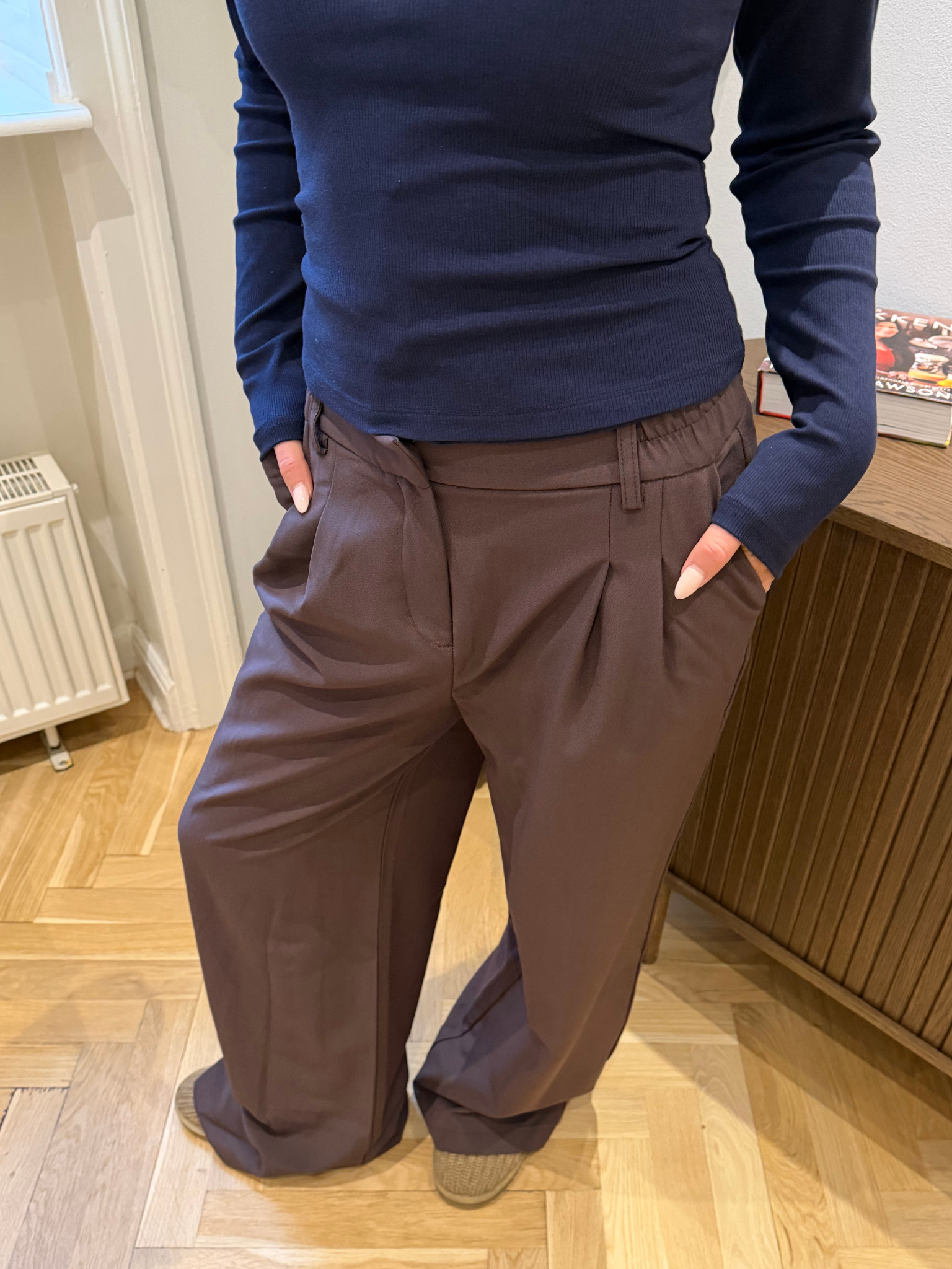 Velkommen til vores helt nye suit pant, der er bredere end vores bestseller suit pant Bella. Stadig low-waist, stadig lækker blød og med to sidelommer - perfekt til skole, fest og alt derimellem..