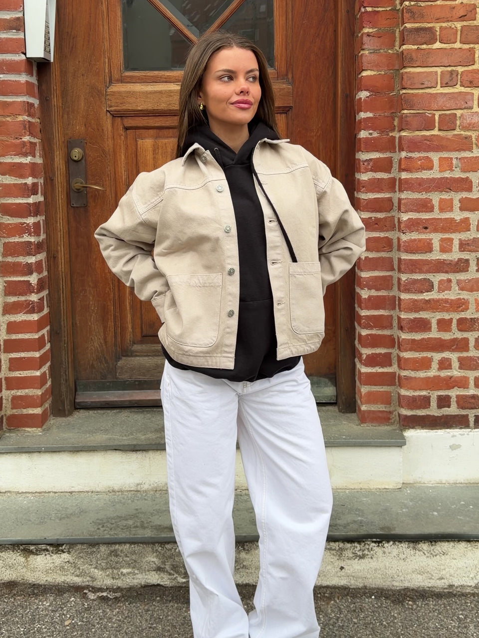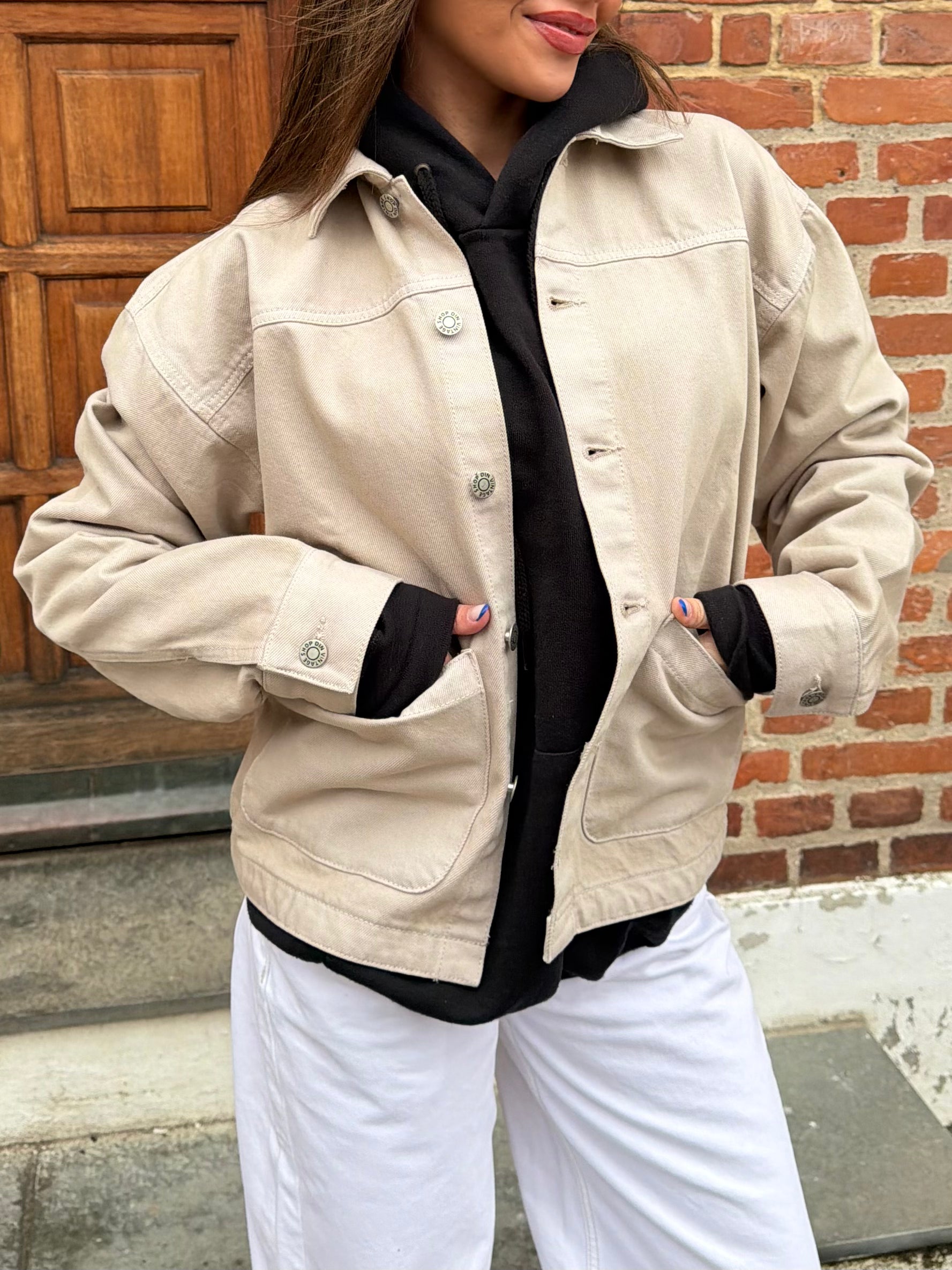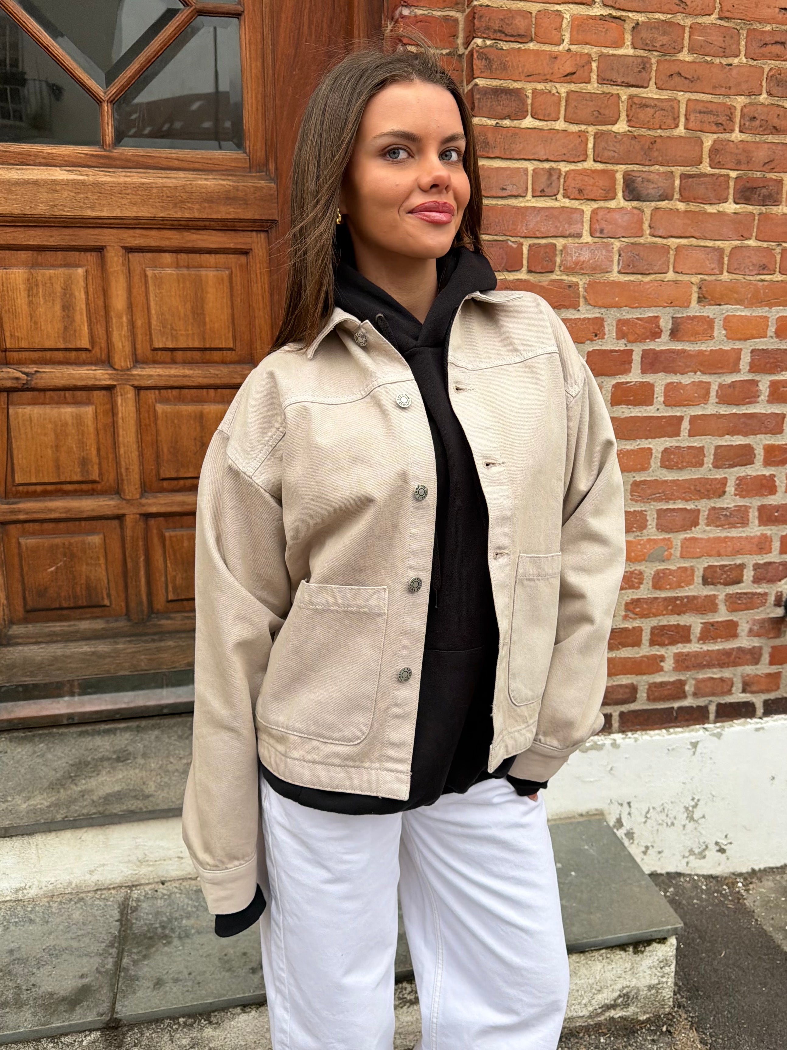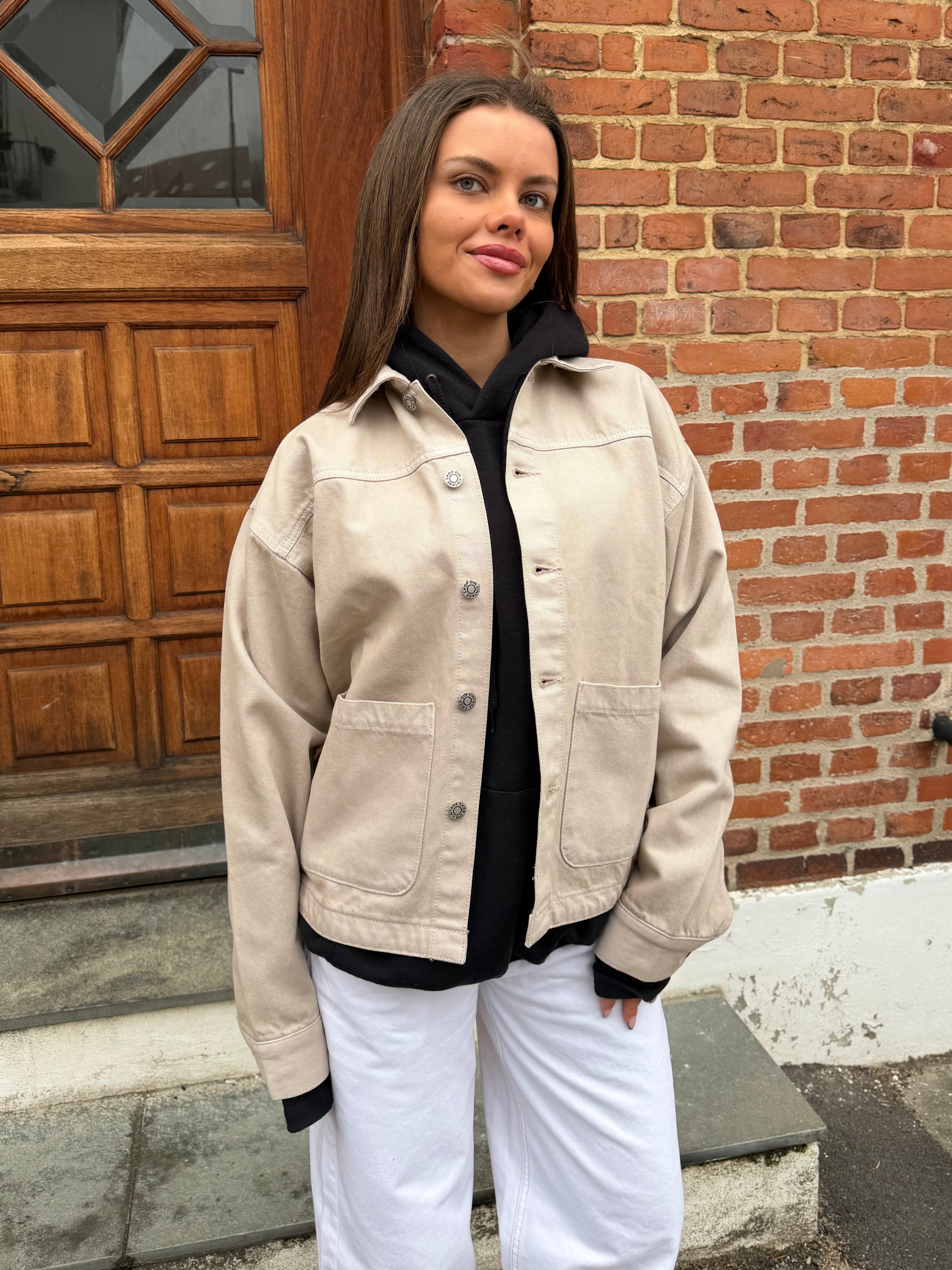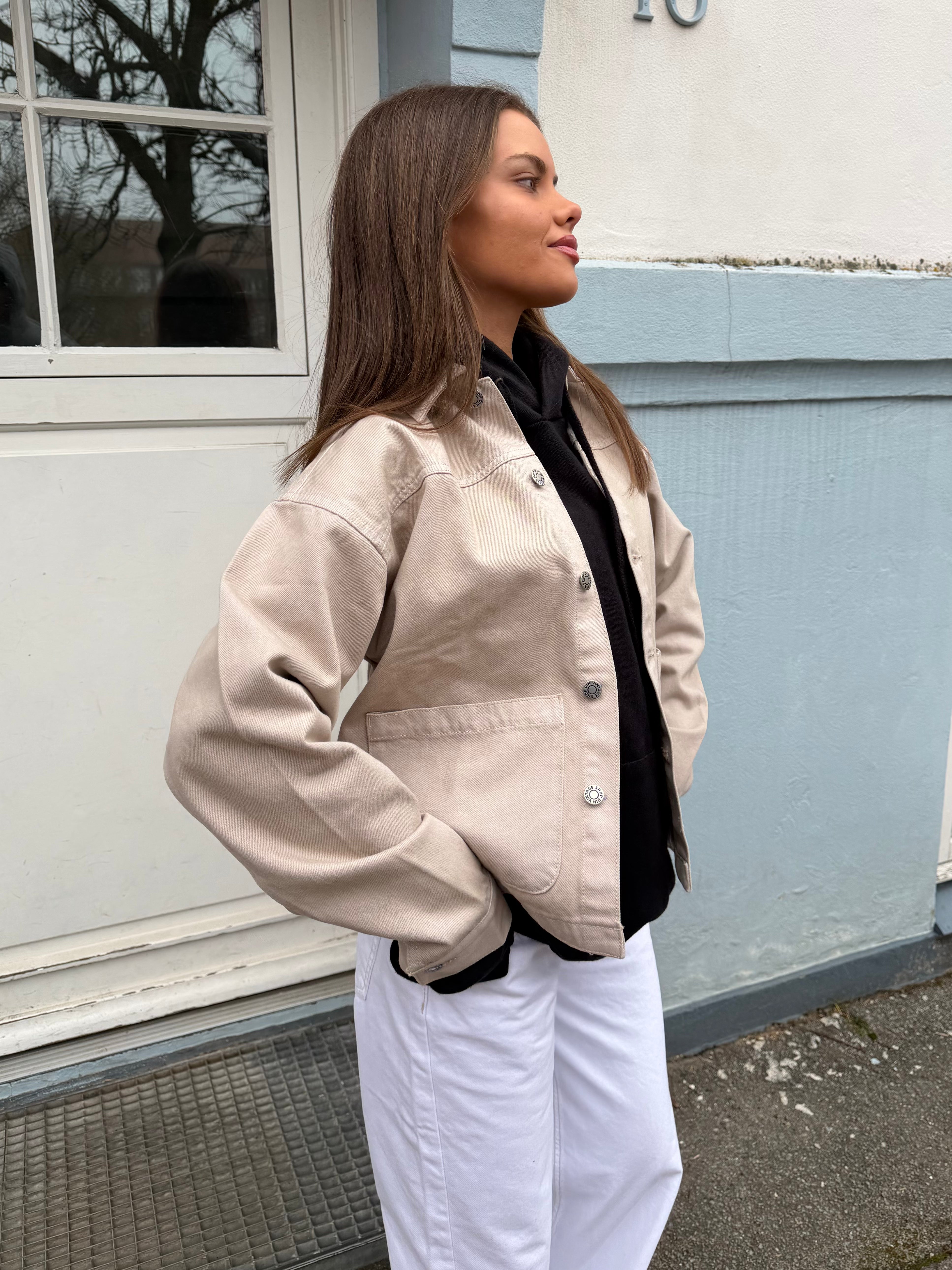 Lækker denim jakke med knaplukning og 2 lommer foran. Let og behagelig - og helt perfekt fit..