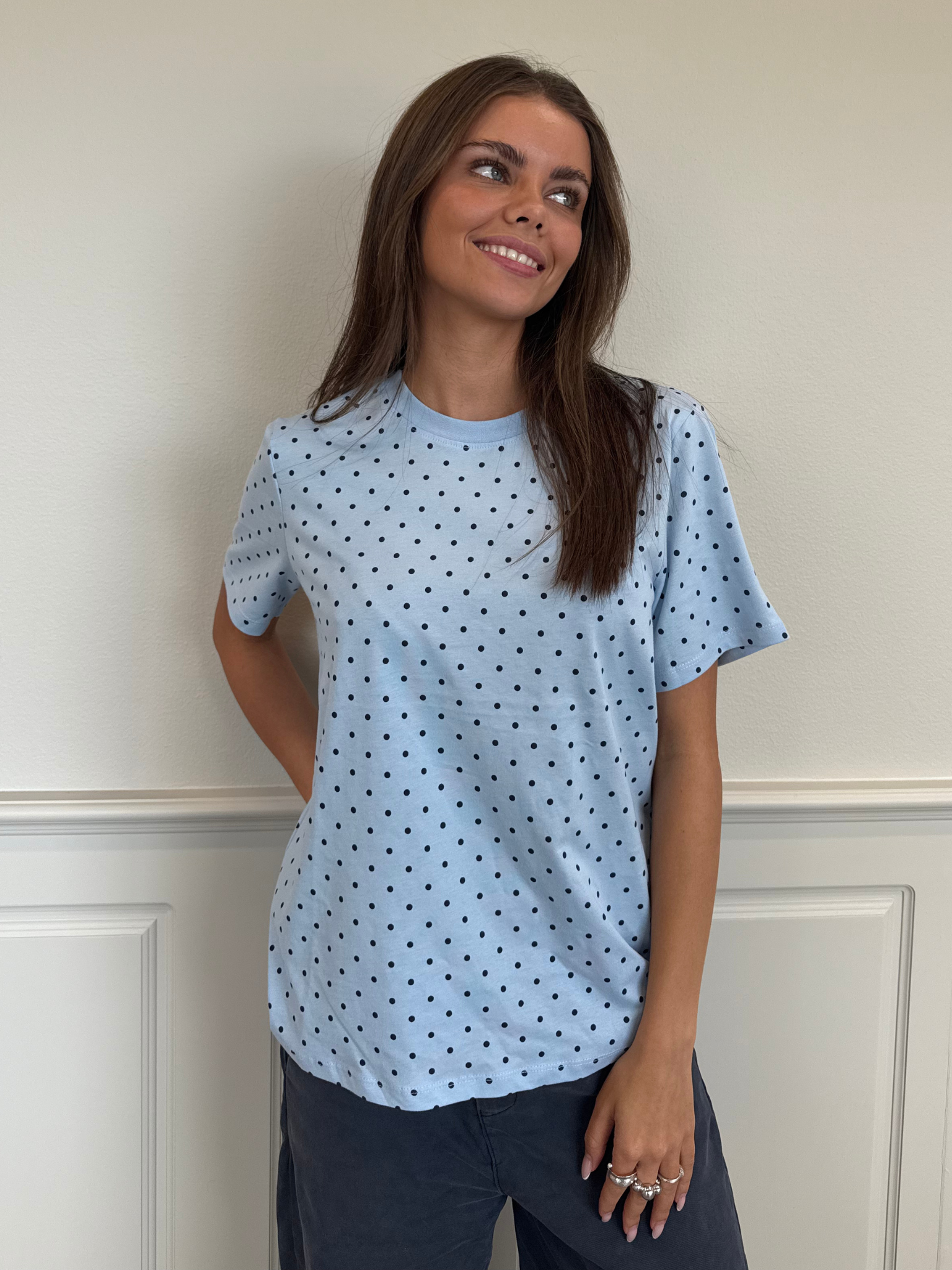Den lette og behagelige Dot Tee er perfekt til hverdagens afslappede stilarter. Med sin runde hals og korte ærmer har den et klassisk og tidløst snit, der passer til de fleste lejligheder. Den maritime blå farve er prydet med et diskret all-over print af små prikker, som tilføjer et stilfuldt og feminint touch. Fremstillet i 100% bomuld tilbyder denne t-shirt både komfort og åndbarhed, hvilket gør den ideel til dagligt brug.