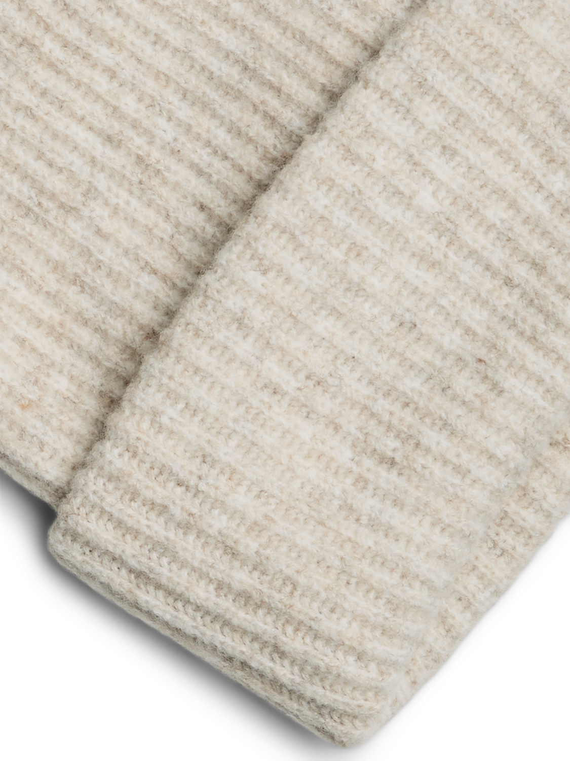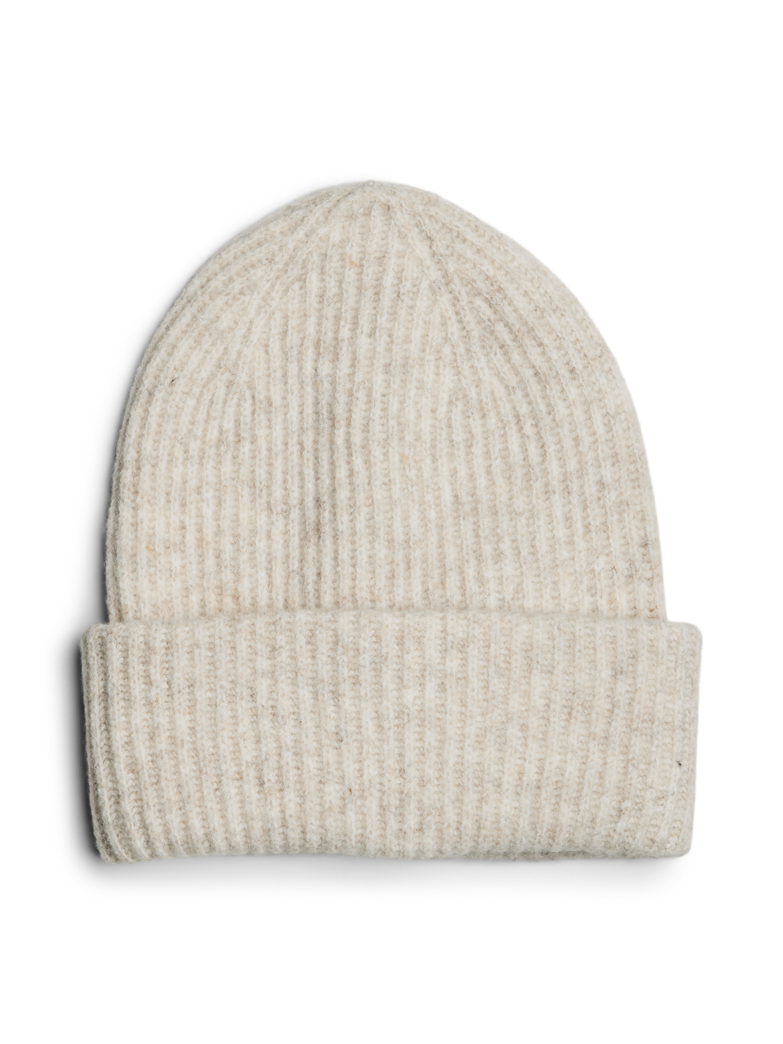 Denne beanie i blødt, ribstrikket materiale kombinerer komfort og stil på en naturlig måde. Stoffet består hovedsageligt af genanvendt polyester med et strejf af cashmere og elastan, hvilket sikrer både blødhed og fleksibilitet. Den lyse farve Whitecap Gray med melange-detaljer gør den nem at style med forskellige outfits, særligt til overgangsperioder i efterår og vinter, hvor den beskytter mod kulden samtidig med et cool look.