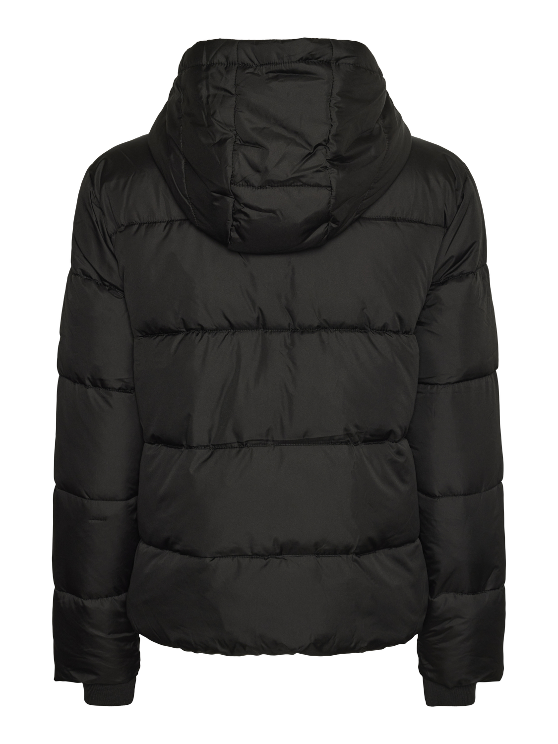 Denne korte pufferjakke er designet til unge kvinder og kombinerer funktionalitet med et moderne udtryk. Jakken har en praktisk hætte og lange ærmer med ribstrikkede manchetter, der sikrer en tæt pasform og ekstra komfort. Foret med polyesterpolstring giver den varme, mens den sorte farve gør den nem at kombinere med forskellige outfits. Jakken lukkes med lynlås og har sidelommer til opbevaring af småting.