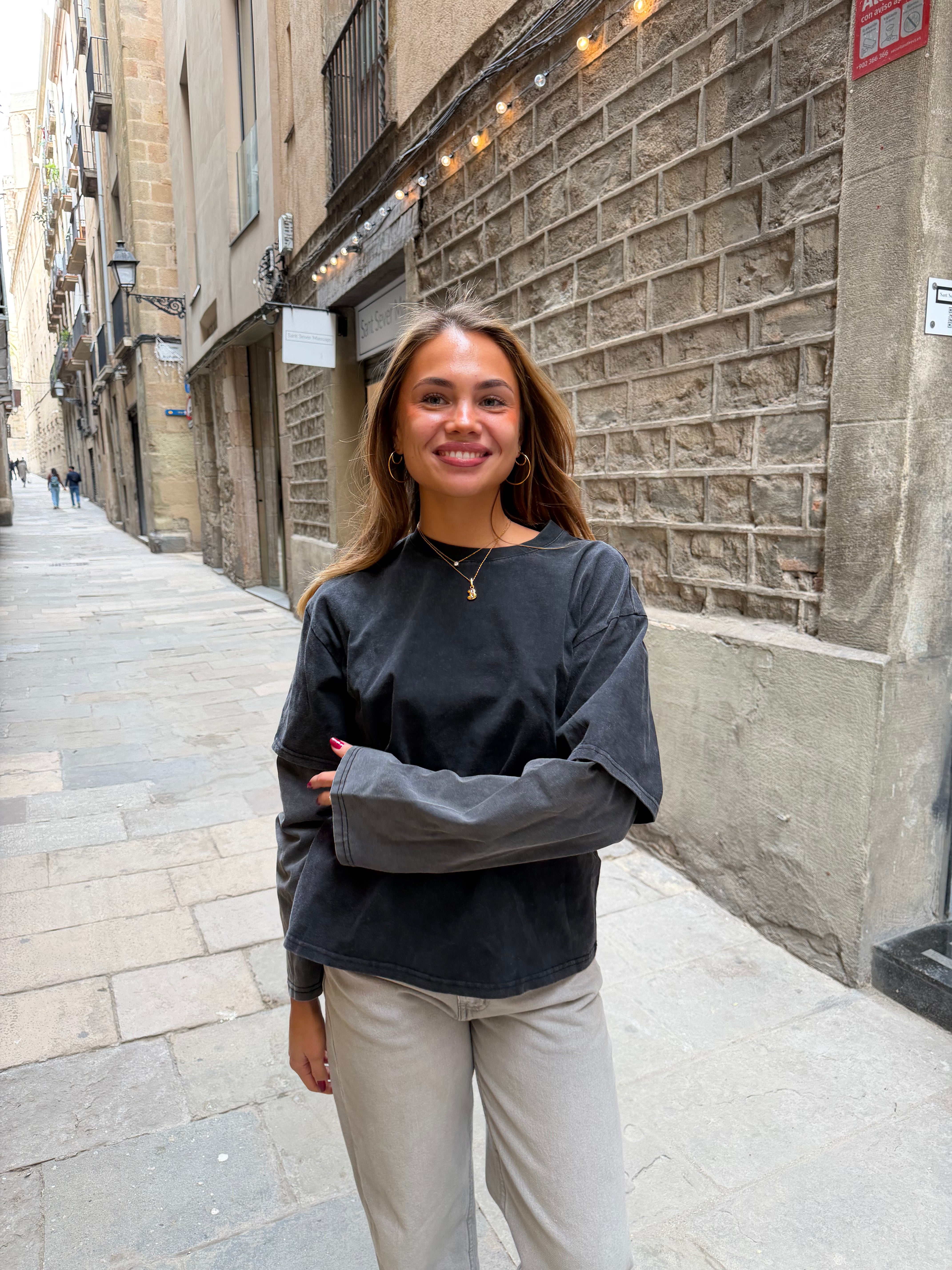 Fin oversize layered tee med lange, vide ærmer. Den langærmede T-shirt er fæstnet i den kortærmede vintage-vaskede tee med korte ærmer.