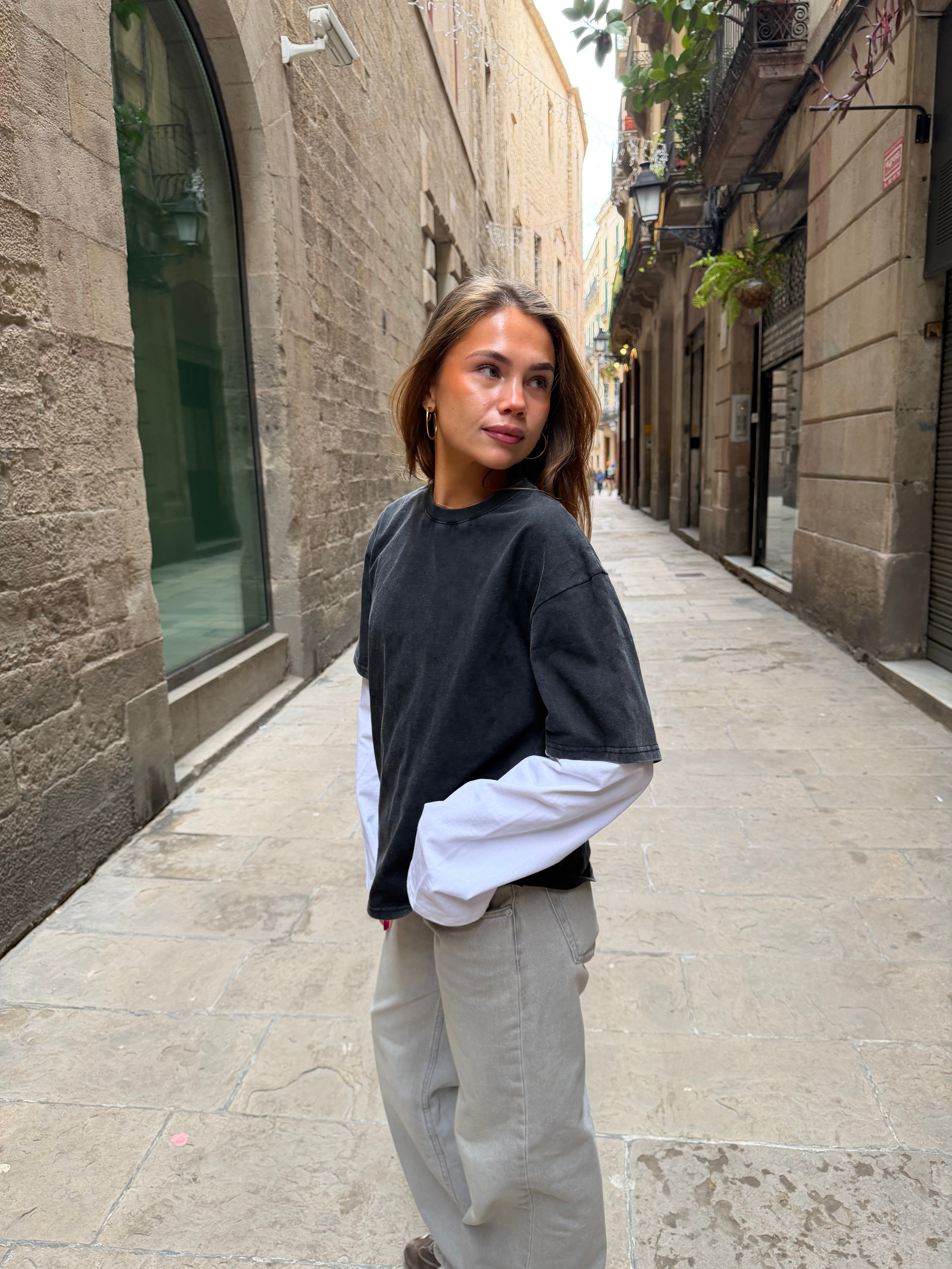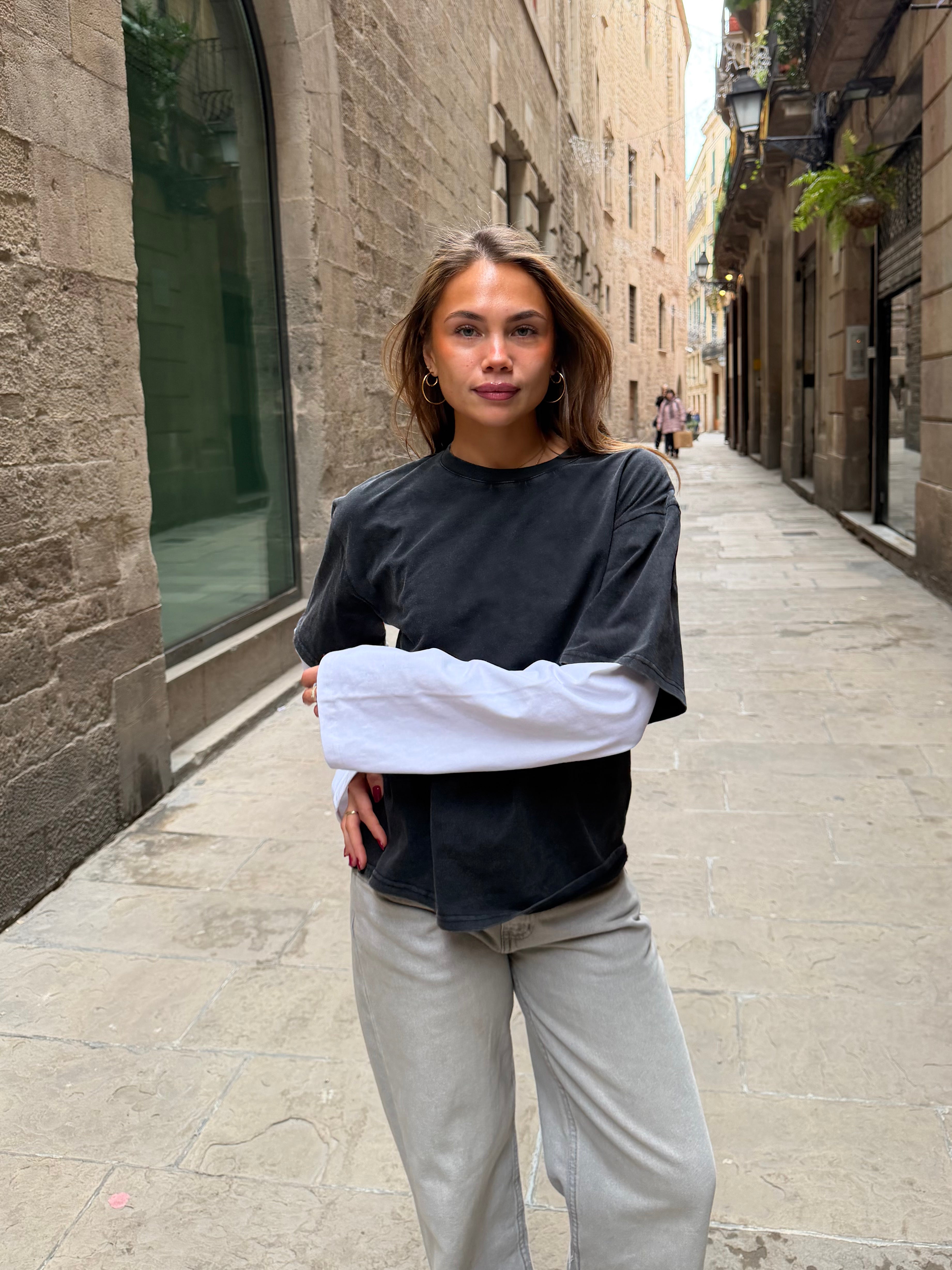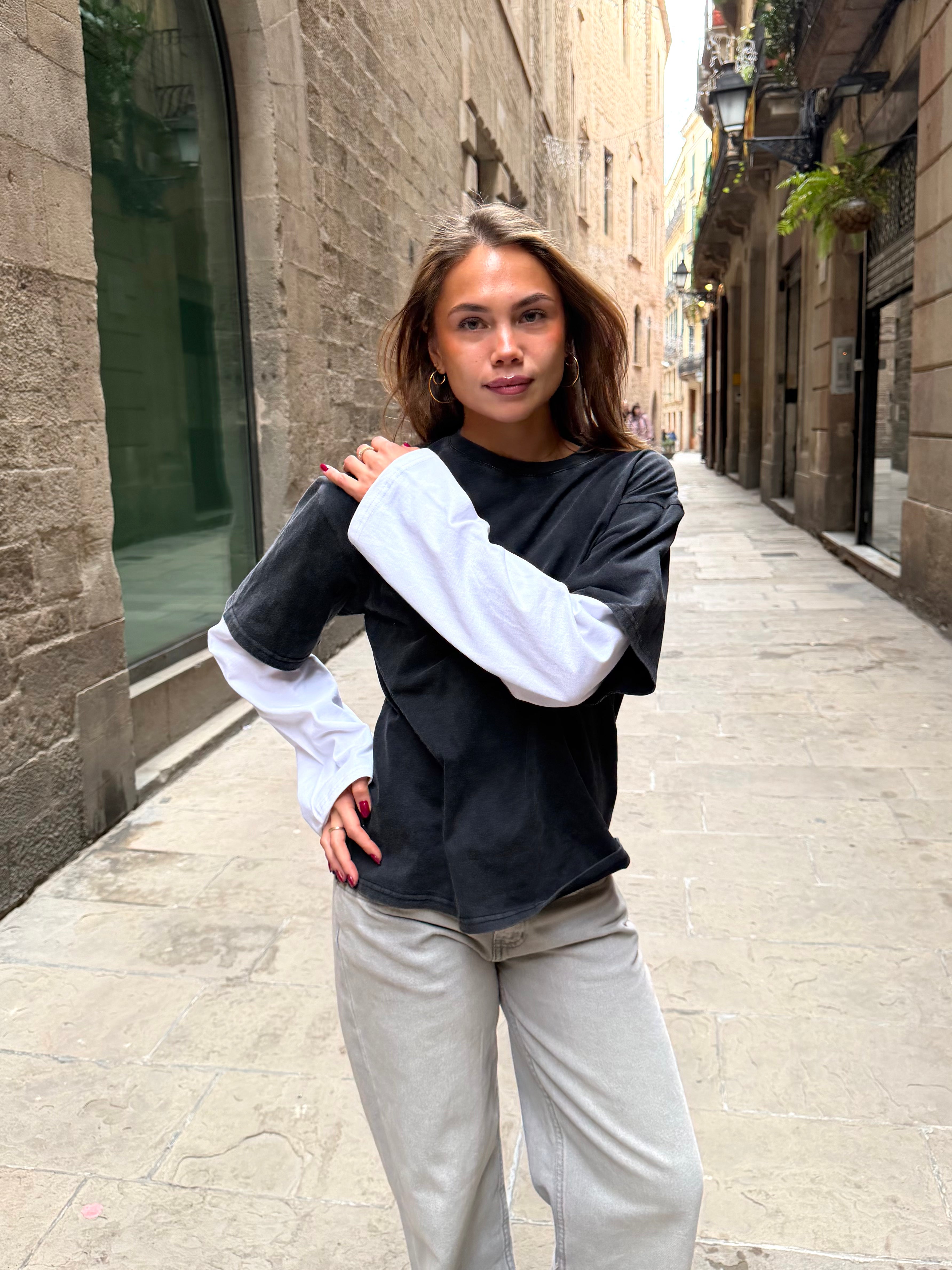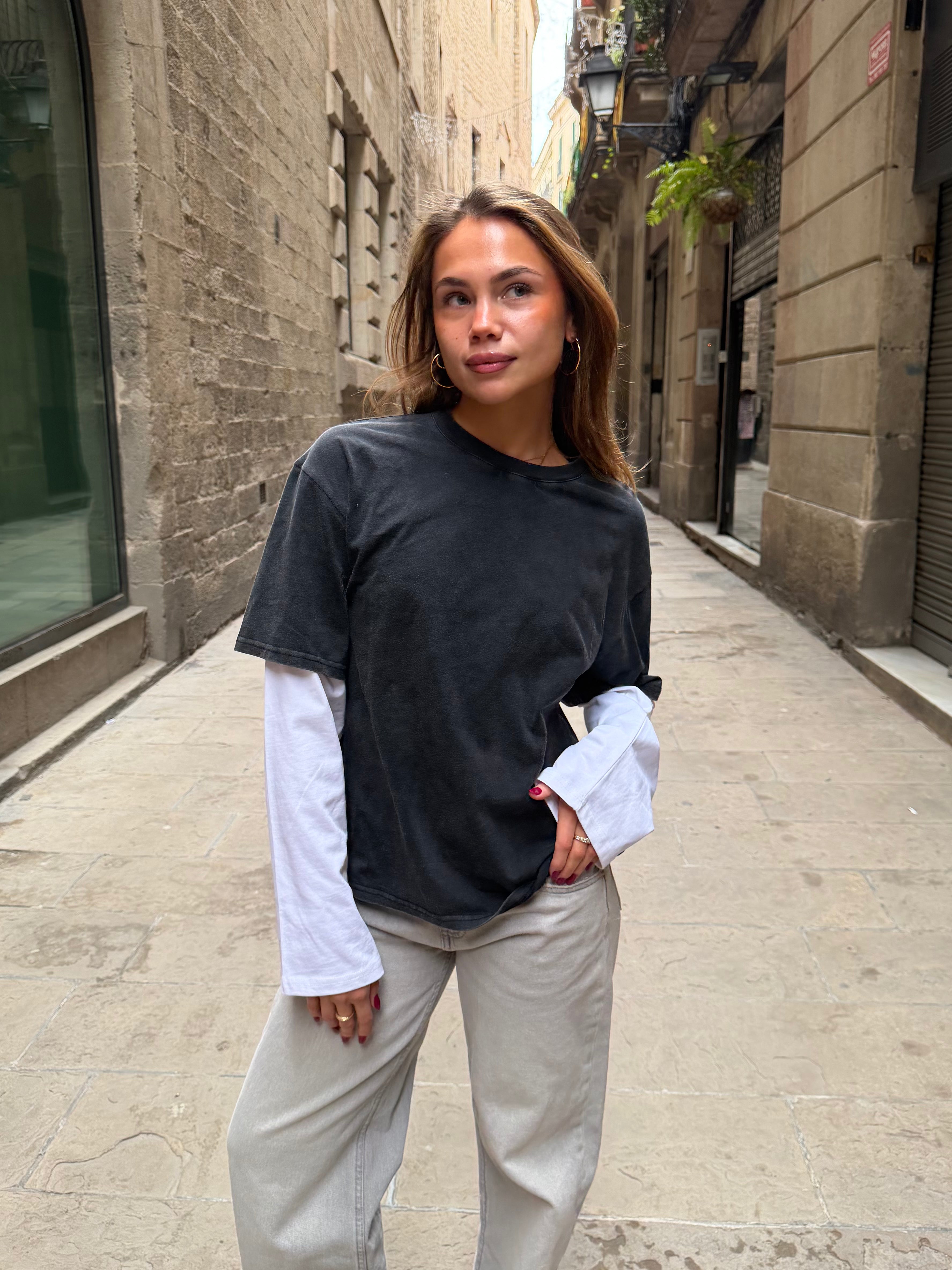Schönes, übergroßes Lagen-T-Shirt mit langen, weiten Ärmeln. Das langärmelige T-Shirt ist an ein kurzärmeliges, vintage-gewaschenes T-Shirt angenäht.