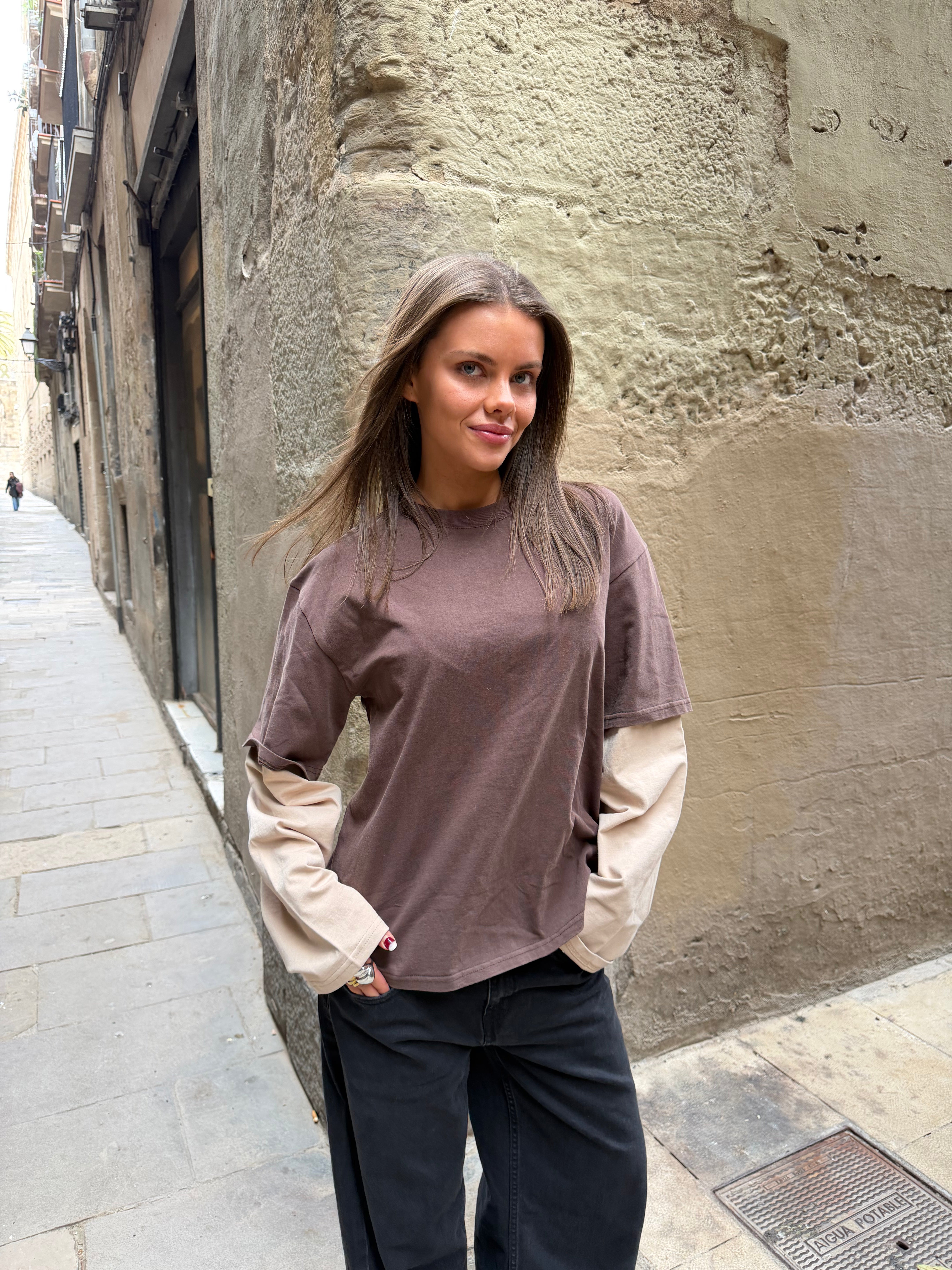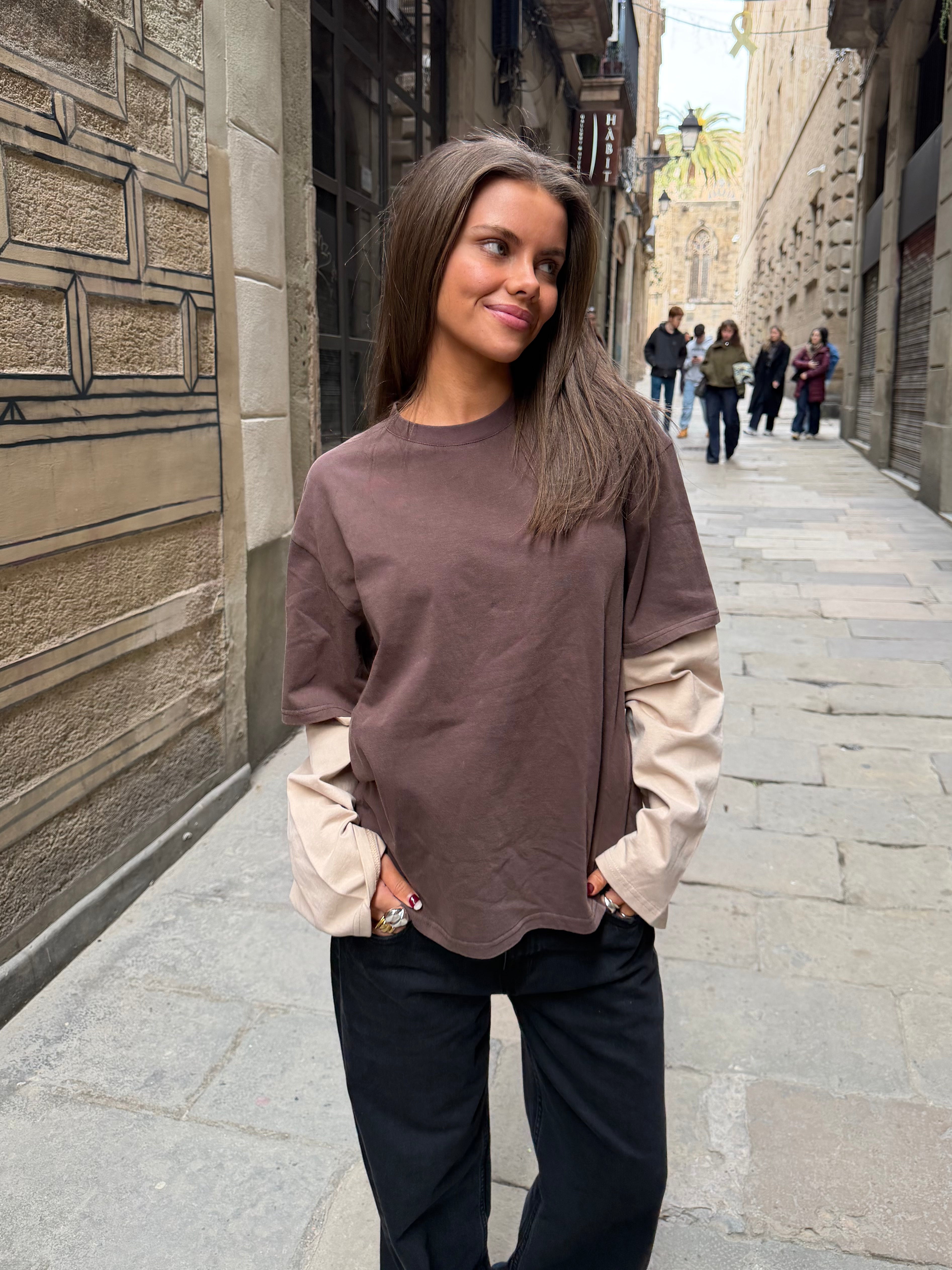 ALVIA Layered T-Shirt – Dunkelbraun/Beige