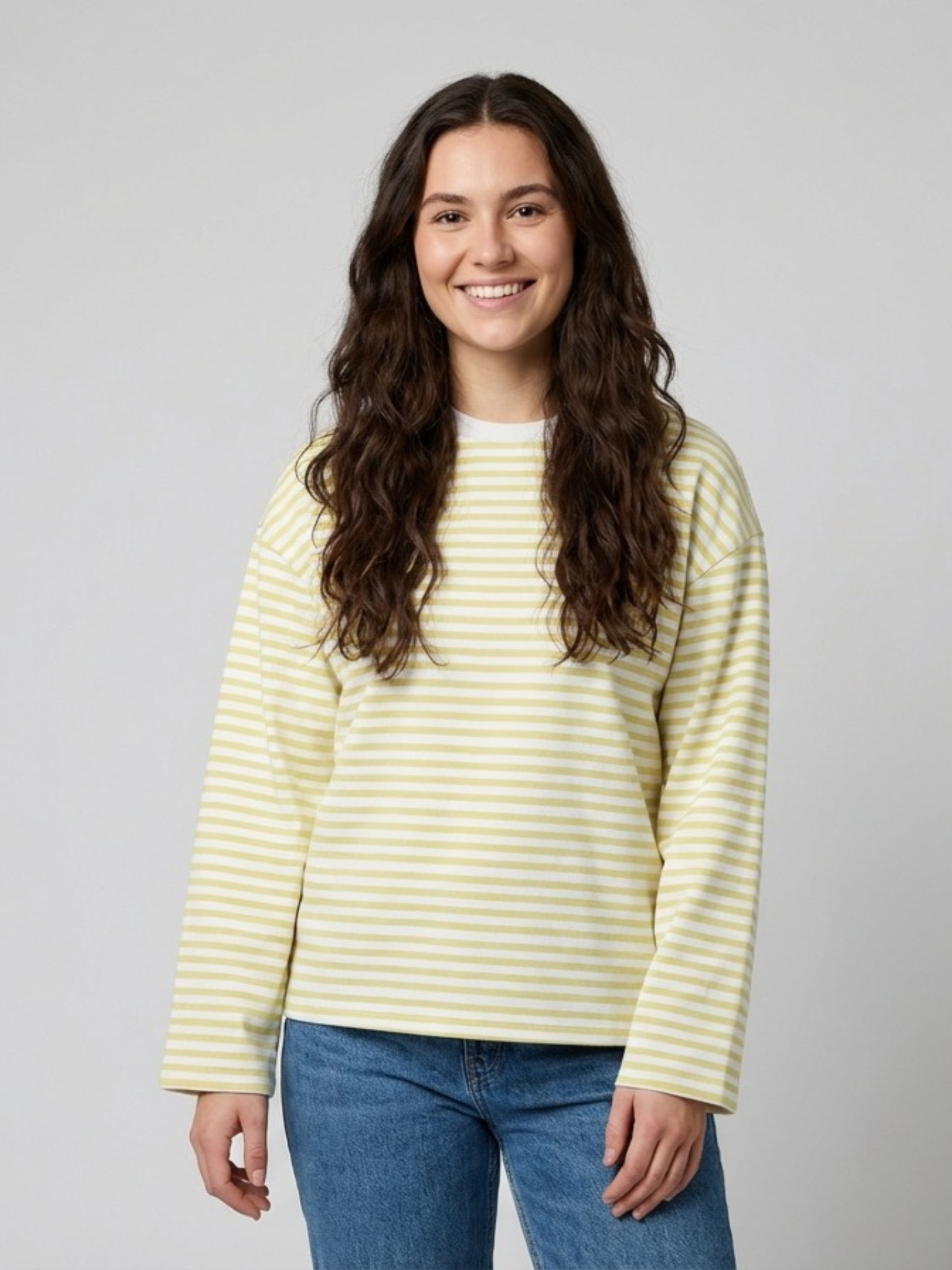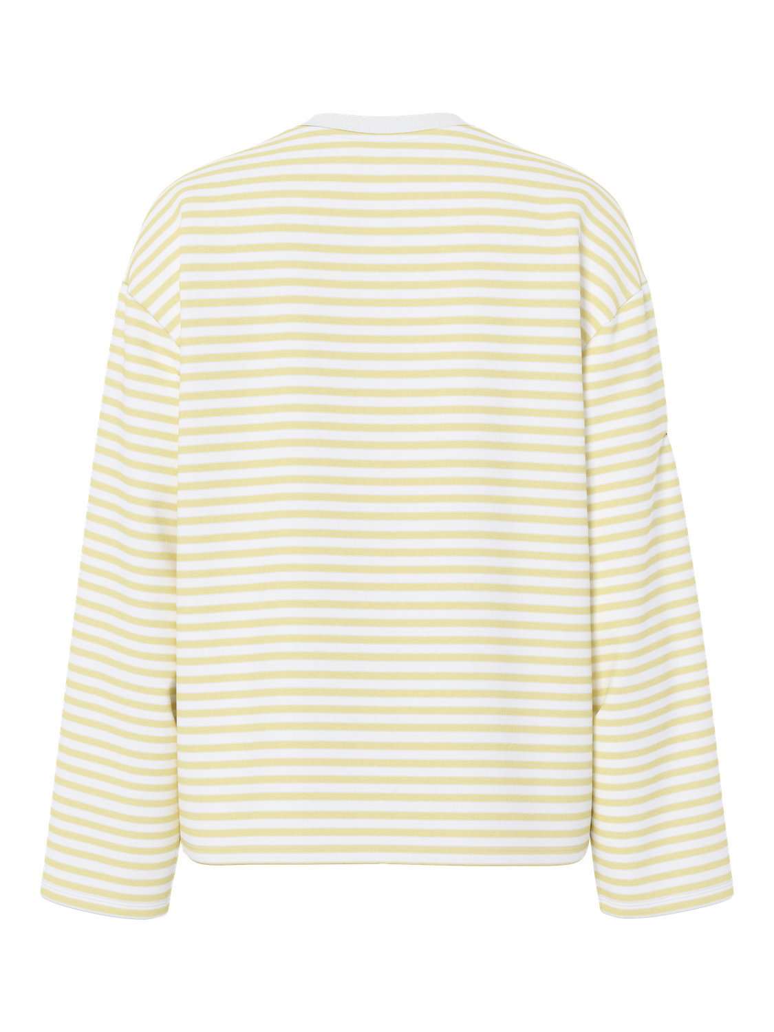 Dieses weiche und bequeme Top mit Rundhalsausschnitt und langen Ärmeln in lässiger Oversized-Passform bietet hohen Tragekomfort. Der Stoff besteht aus 75 % Baumwolle und 25 % Polyester, wobei die Baumwolle zu mindestens 20 % aus recyceltem Material besteht – ein Beitrag zu mehr Nachhaltigkeit. Die vorgefärbten Streifen sind in den Stoff eingewebt und ergeben ein dezentes, stilvolles Muster in einem hellen Weißton namens „Bright White“.