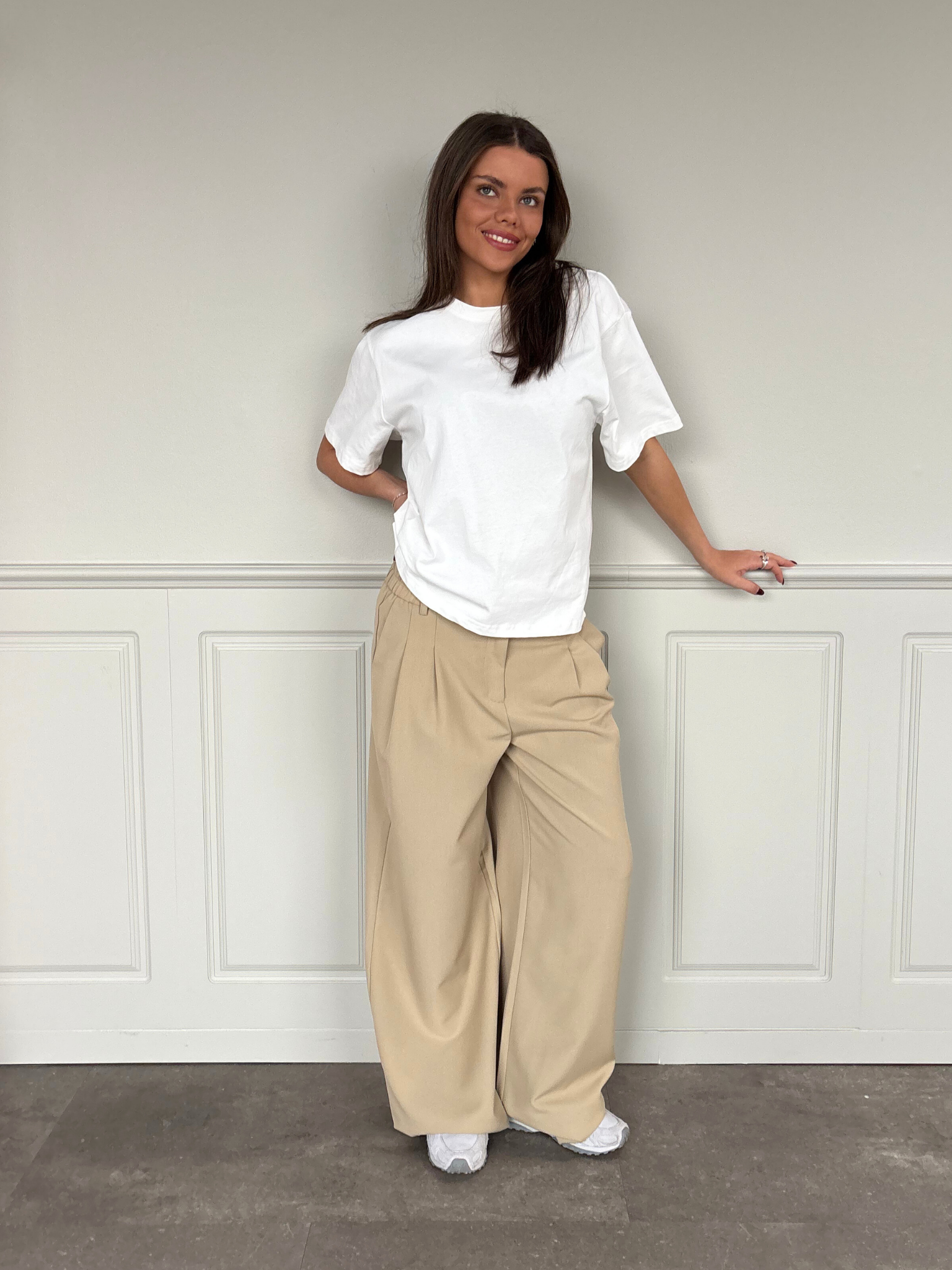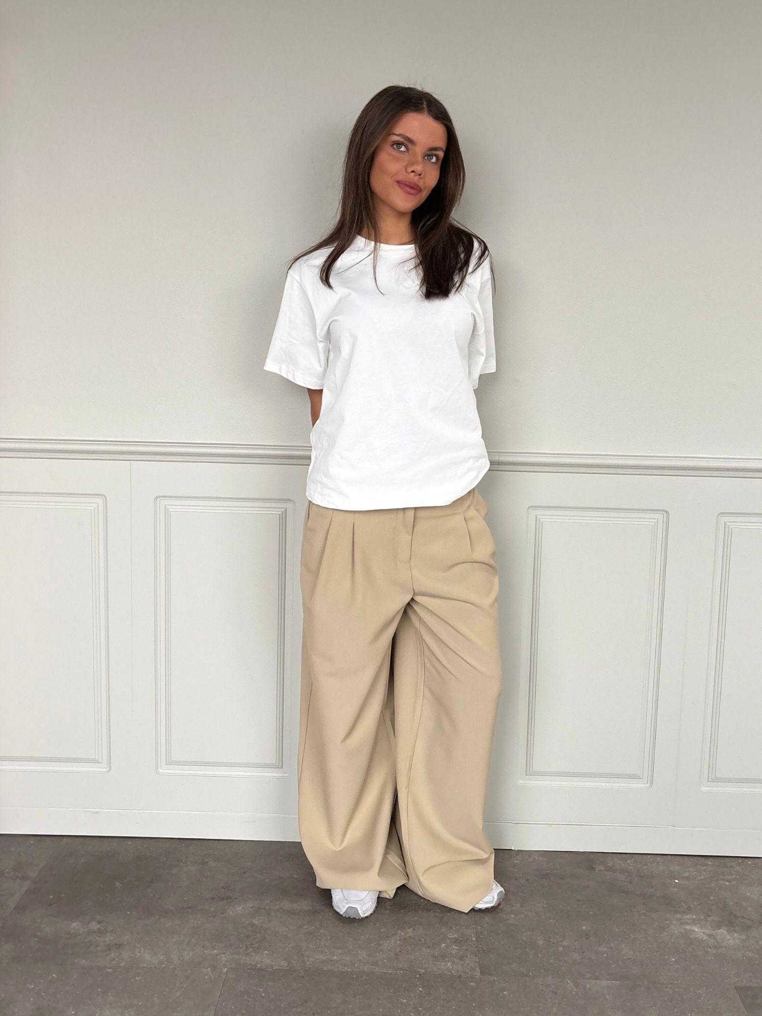 Velkommen til vores helt nye suit pant, der er bredere end vores bestseller suit pant Bella. Stadig low-waist, stadig lækker blød og med to sidelommer - perfekt til skole, fest og alt derimellem..