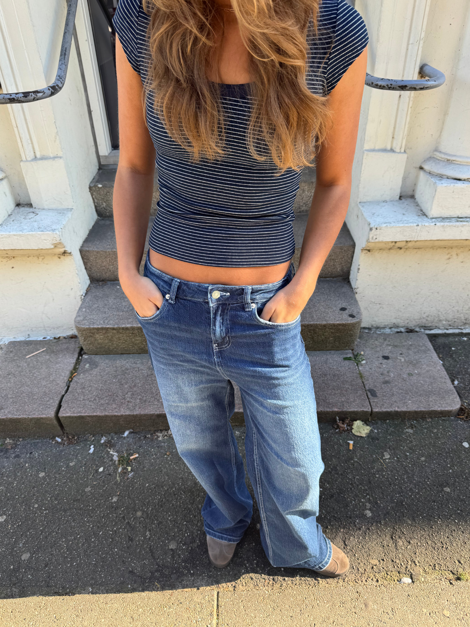 - Pasform: Baggy fit og mid talje for en afslappet, moderne stil