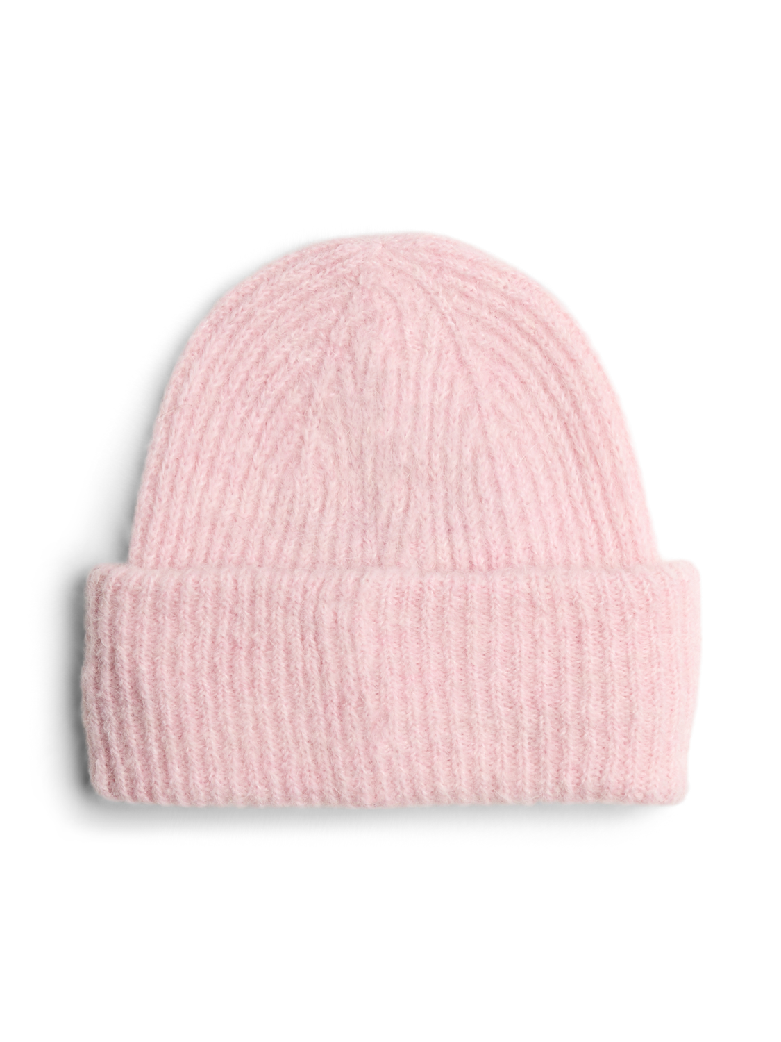 Denne hue i alpaca blend kombinerer blødhed og varme med en ribstrikket struktur, der giver et afslappet og hyggeligt udtryk. Den er fremstillet med et bæredygtigt fokus på materialer, hvor mindst 20% af fibrene er certificeret alpaca. Farven Pink-a-boo giver et feminint og blidt touch til efterårs- og vintergarderoben.