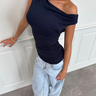 Fineste asymetriske top i blød jersey kvalitet , med masser af stretch & off-the-shoulder effect på den ene side. Rynket ned langs taljen..