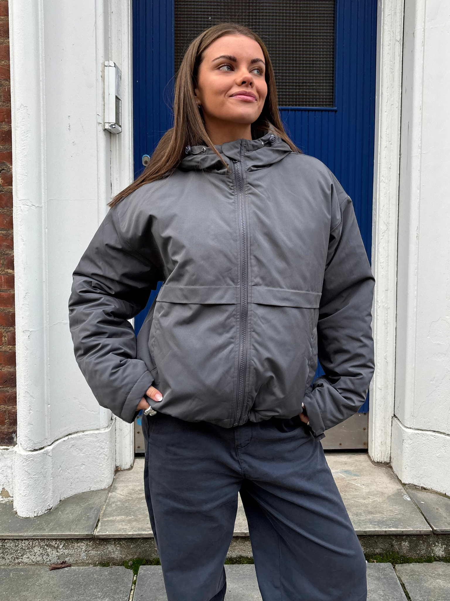 Virkelig lækker jakke med en blød overflade. Perfekt længde, der kan strammes til forneden. Lækker stor hætte..