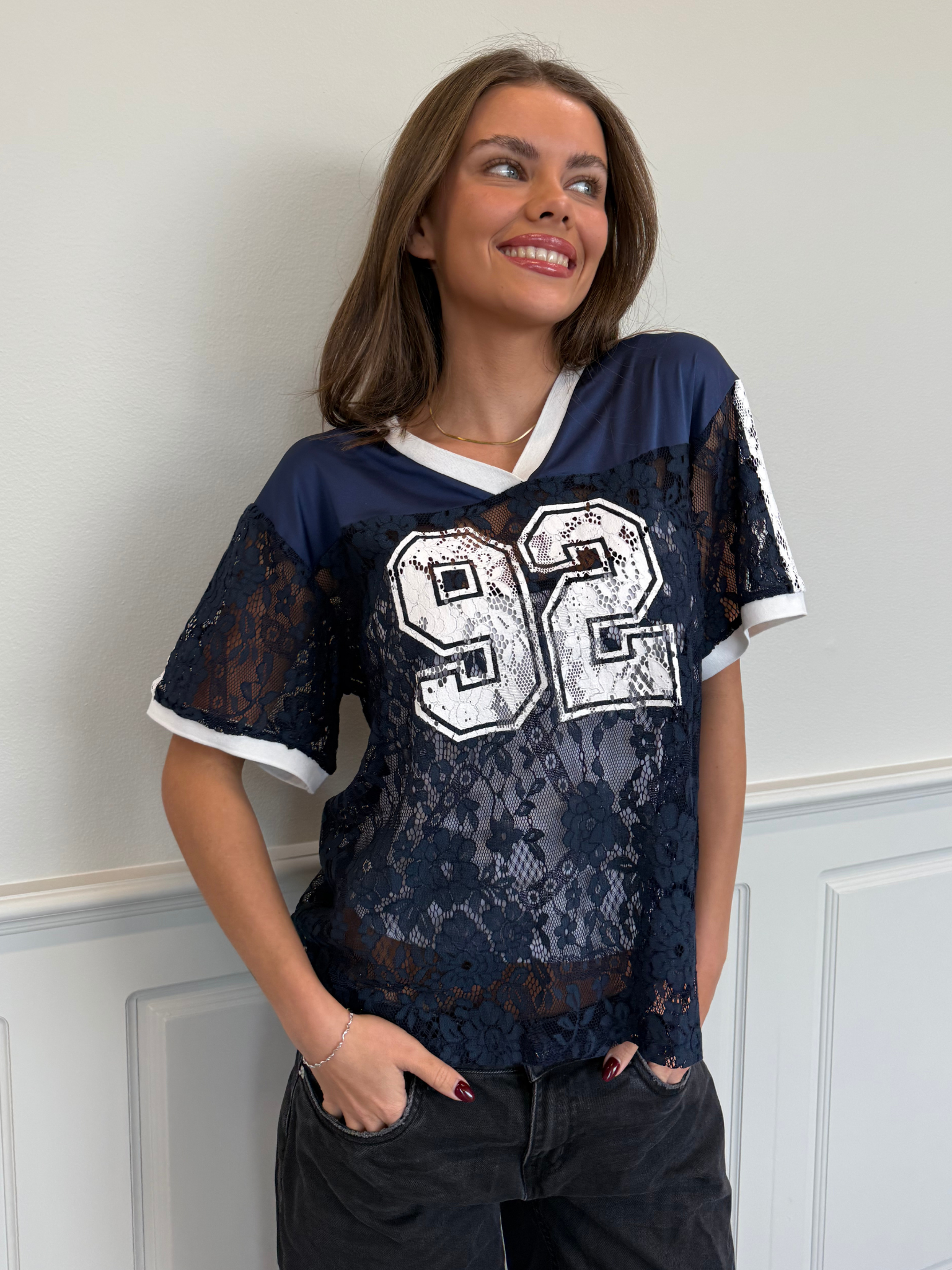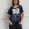 Blonde fodboldbluse i oversize fit. Stort print på brystet og hvide kontrast detaljer