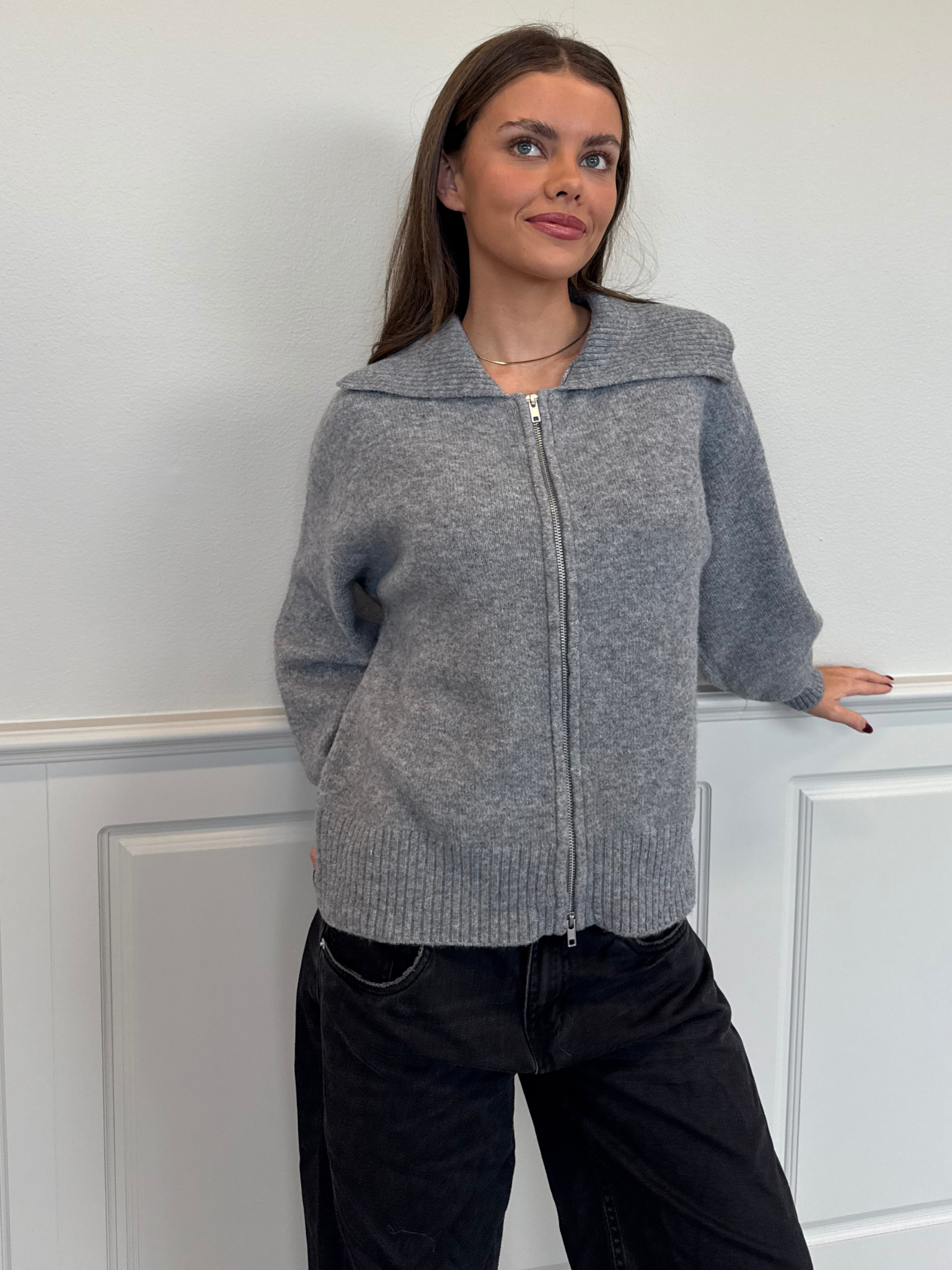 Denne strikkede cardigan har en tætsiddende pasform, som giver et flot og moderne look. Den har rund hals og ribstrikkede ærmekanter, der sikrer en komfortabel og tæt pasform ved håndleddene. Cardiganen er udført i en blanding af materialer, der kombinerer holdbarhed og blødhed, hvilket gør den ideel til efterårssæsonen. Detaljen med dobbelt lynlås giver et praktisk og stilfuldt touch med mulighed for selv at style.