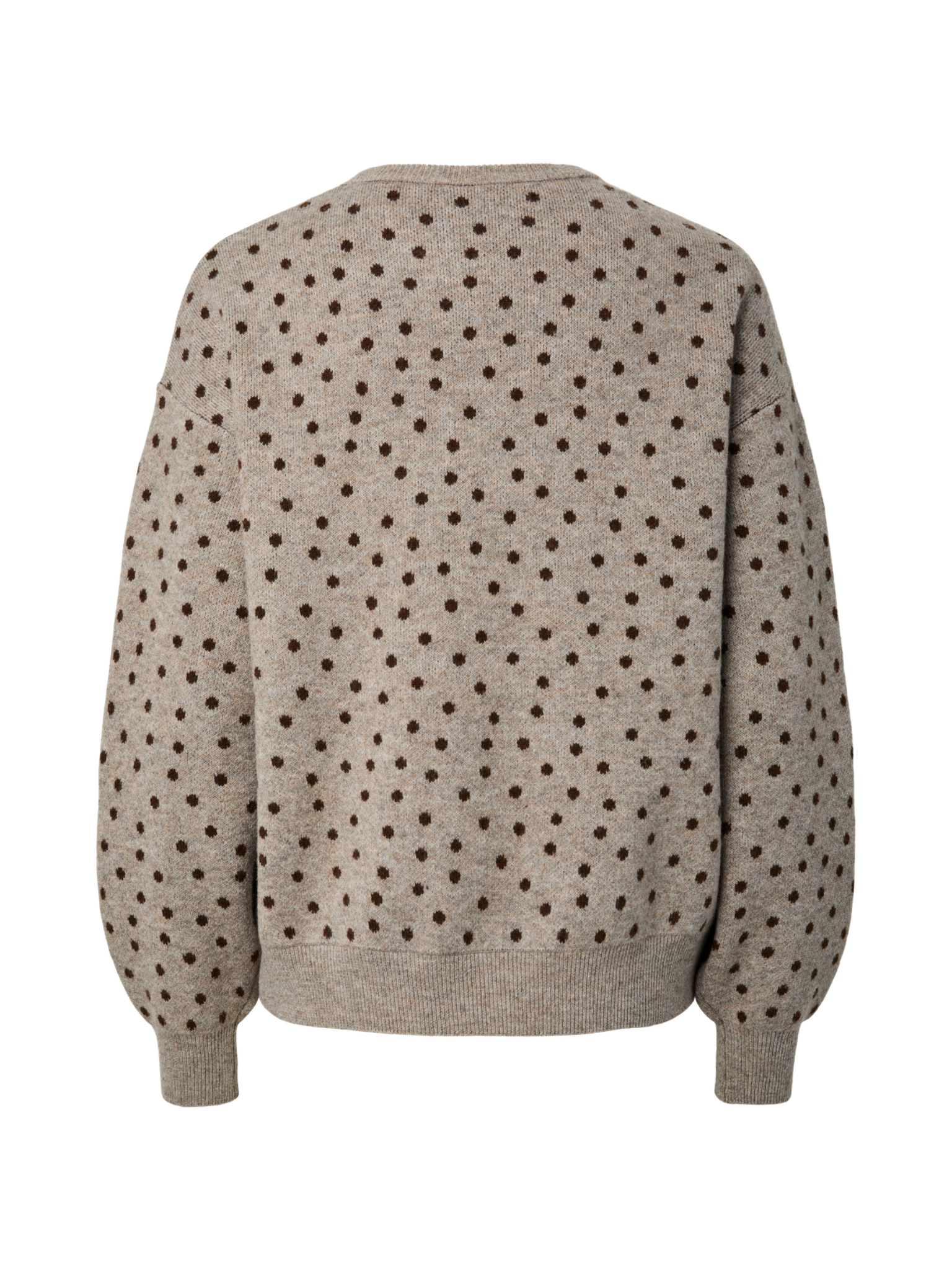 Denne strikkede trøje med rund hals har en løs pasform, der sikrer komfort og bevægelsesfrihed. Det brune dot-mønster tilføjer et diskret, men stilfuldt element til designet, hvilket gør trøjen til et alsidigt valg til vinterens garderobe. Trøjen er fremstillet med omtanke for miljøet og indeholder mindst 50% genanvendt polyester, kombineret med akryl og elastan for både holdbarhed og let strækbarhed.