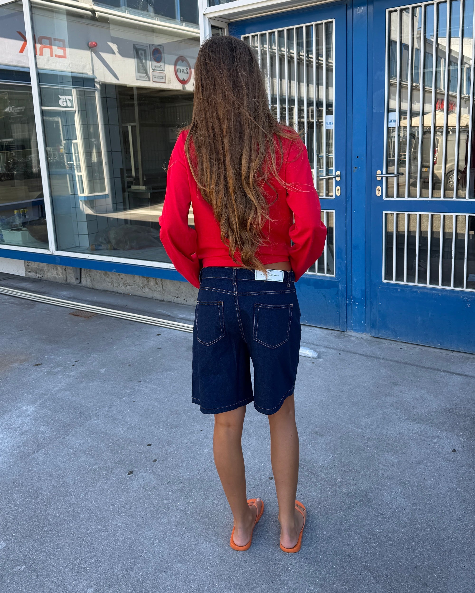 Vi har designet de smukkeste baggy Olivia jorts i farven dark blue, som har taget os sindsygt lang tid at perfektionere! Nu er de klar til at lufte dine brune sommerben