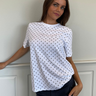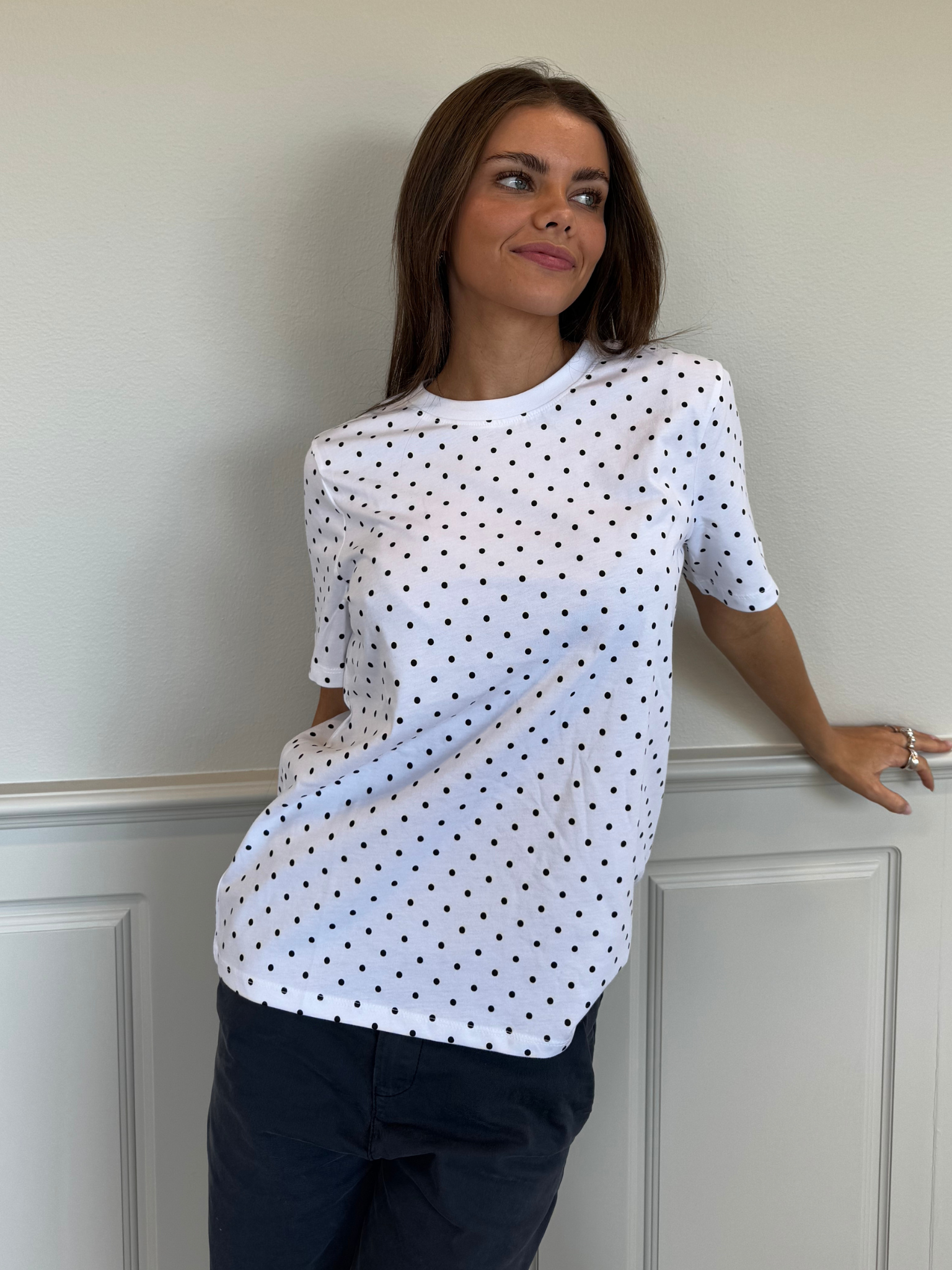 Denne klassiske T-shirt med korte ærmer har et let rundet halsudskæring og en behagelig regular pasform, som gør den oplagt til hverdagsbrug. Den er lavet af 100% bomuld, hvilket sikrer en naturlig og komfortabel følelse mod huden. Med et diskret prikmønster over hele overfladen tilfører den et stilfuldt, men alligevel enkelt look i en lys, næsten hvid nuance.