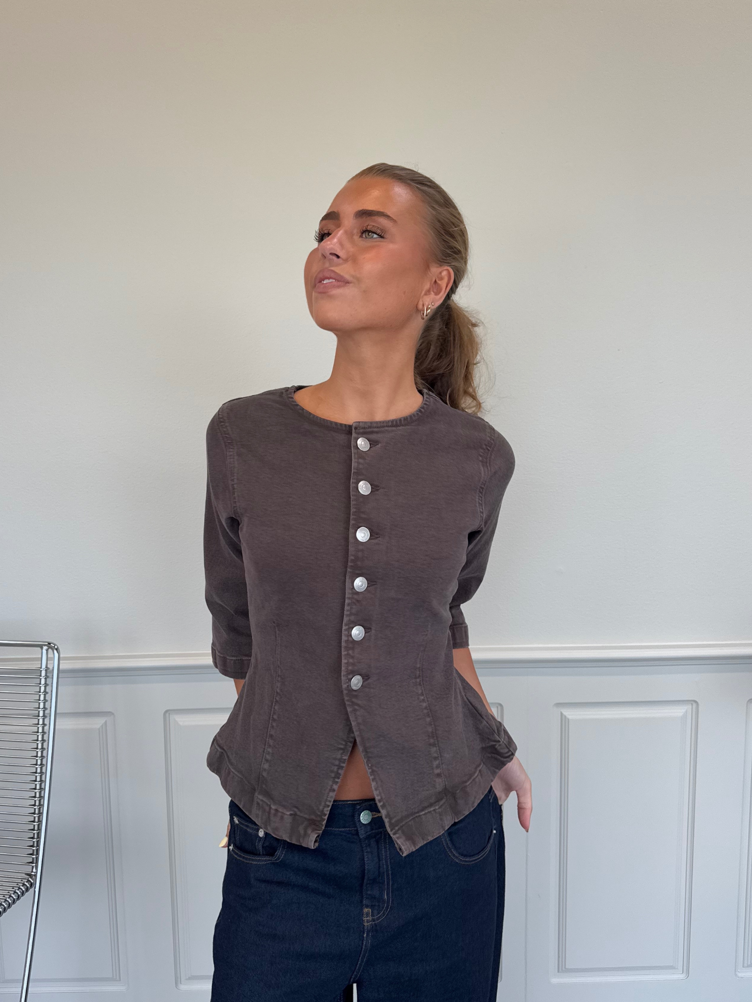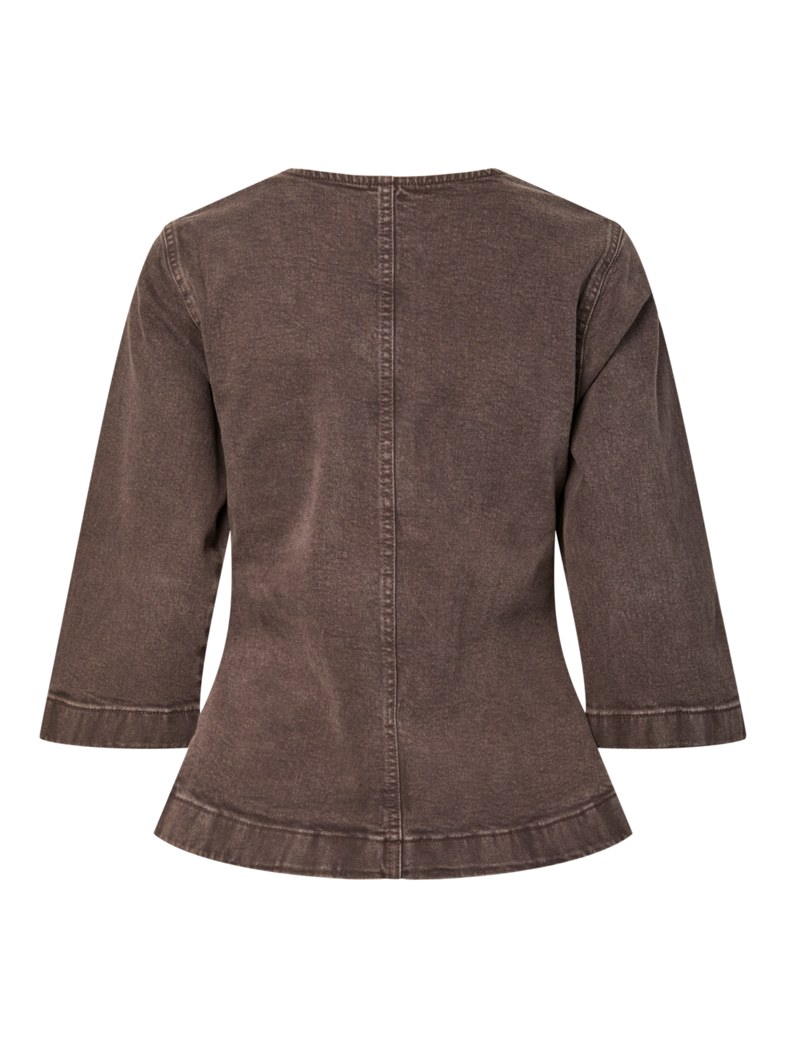 Denne 3/4-ærmede denimtop har en slank pasform og et elegant cut-away krave design, der giver et moderne udtryk. Den er lavet af en robust bomuldsblanding, hvor 20% består af genanvendt bomuld, hvilket både giver komfort og en bæredygtig profil. Farven Hot fudge fremhæver dens varme, mørkebrune nuance, som er ideel til efterårets garderobe.