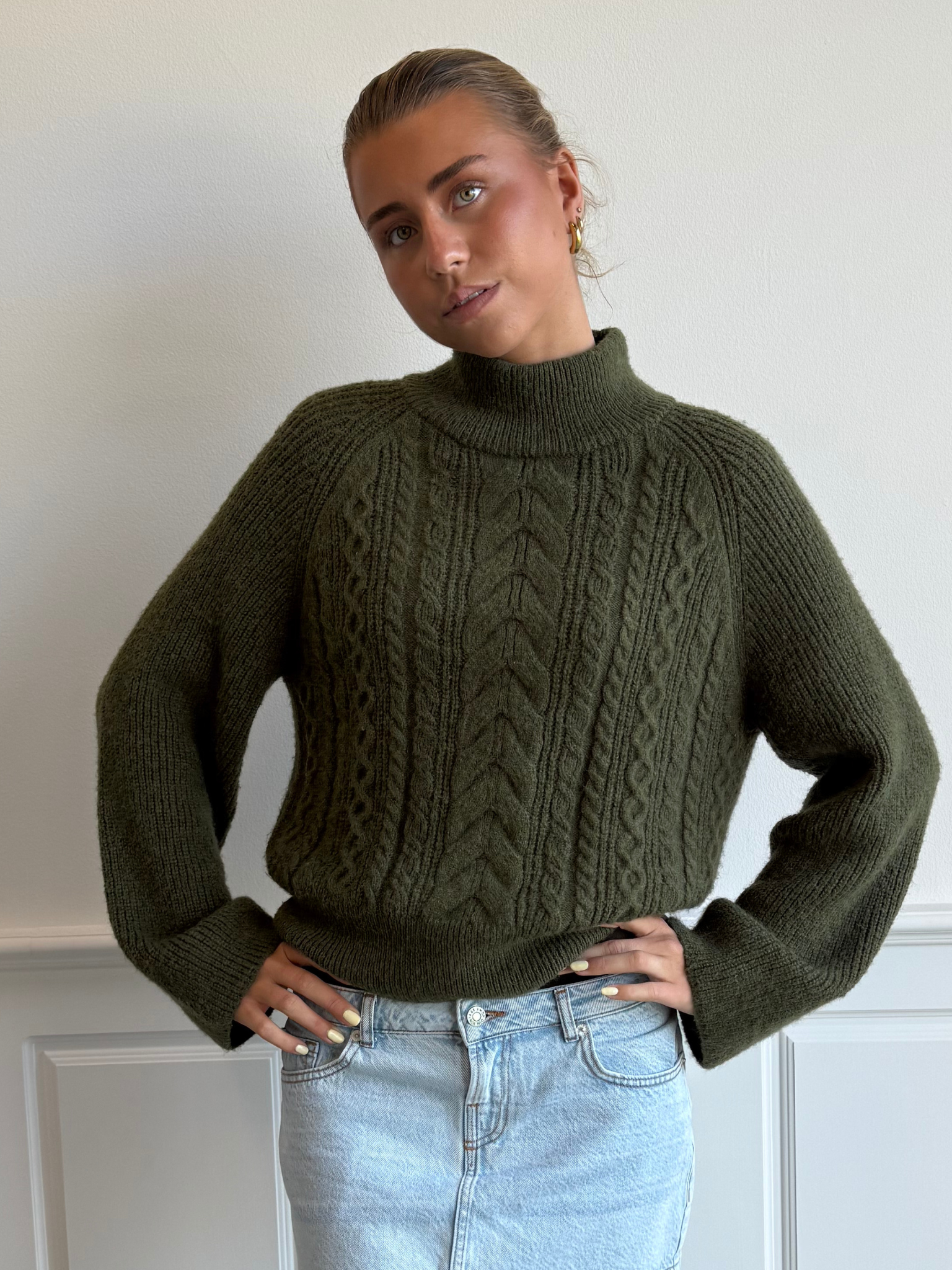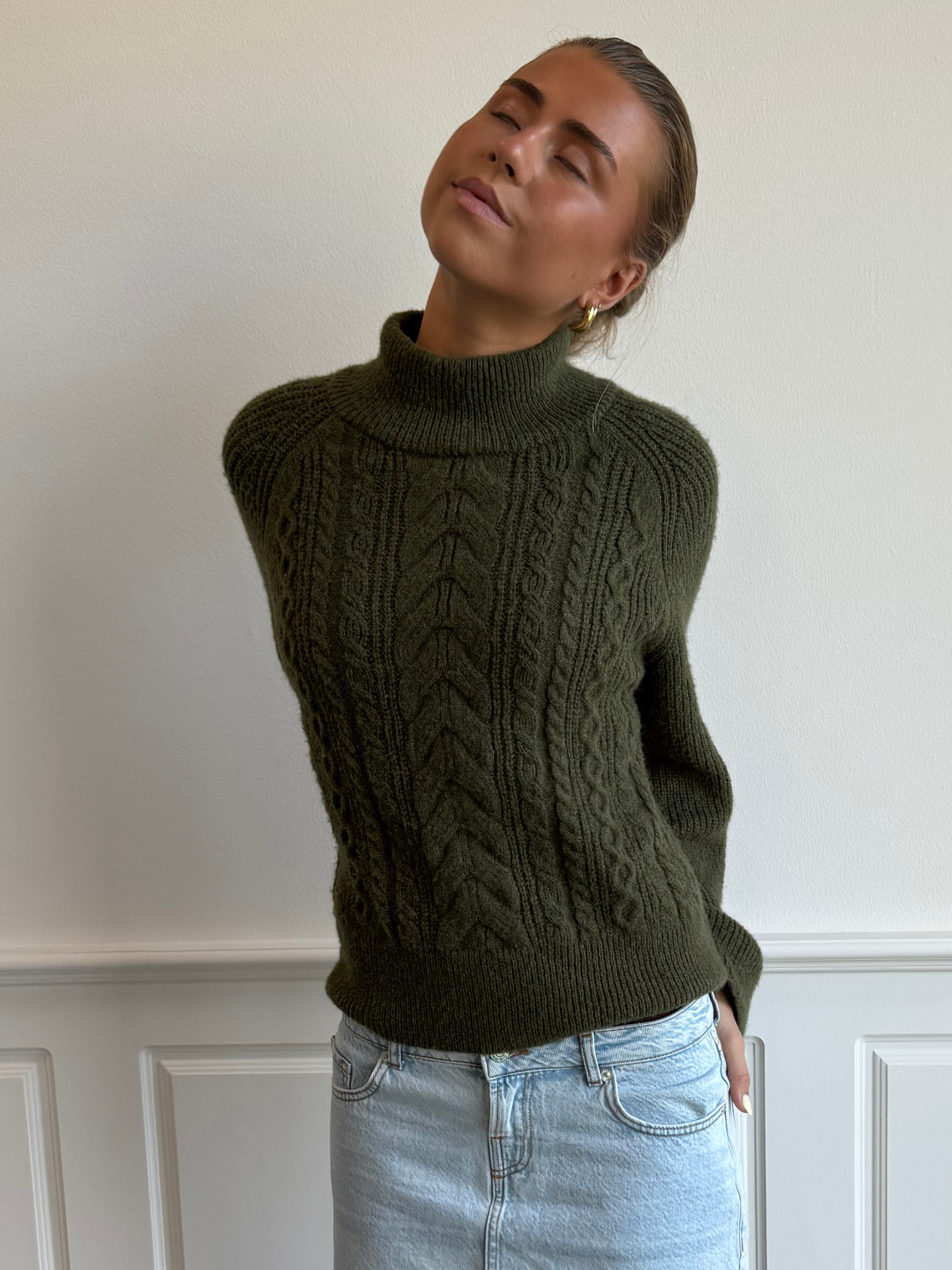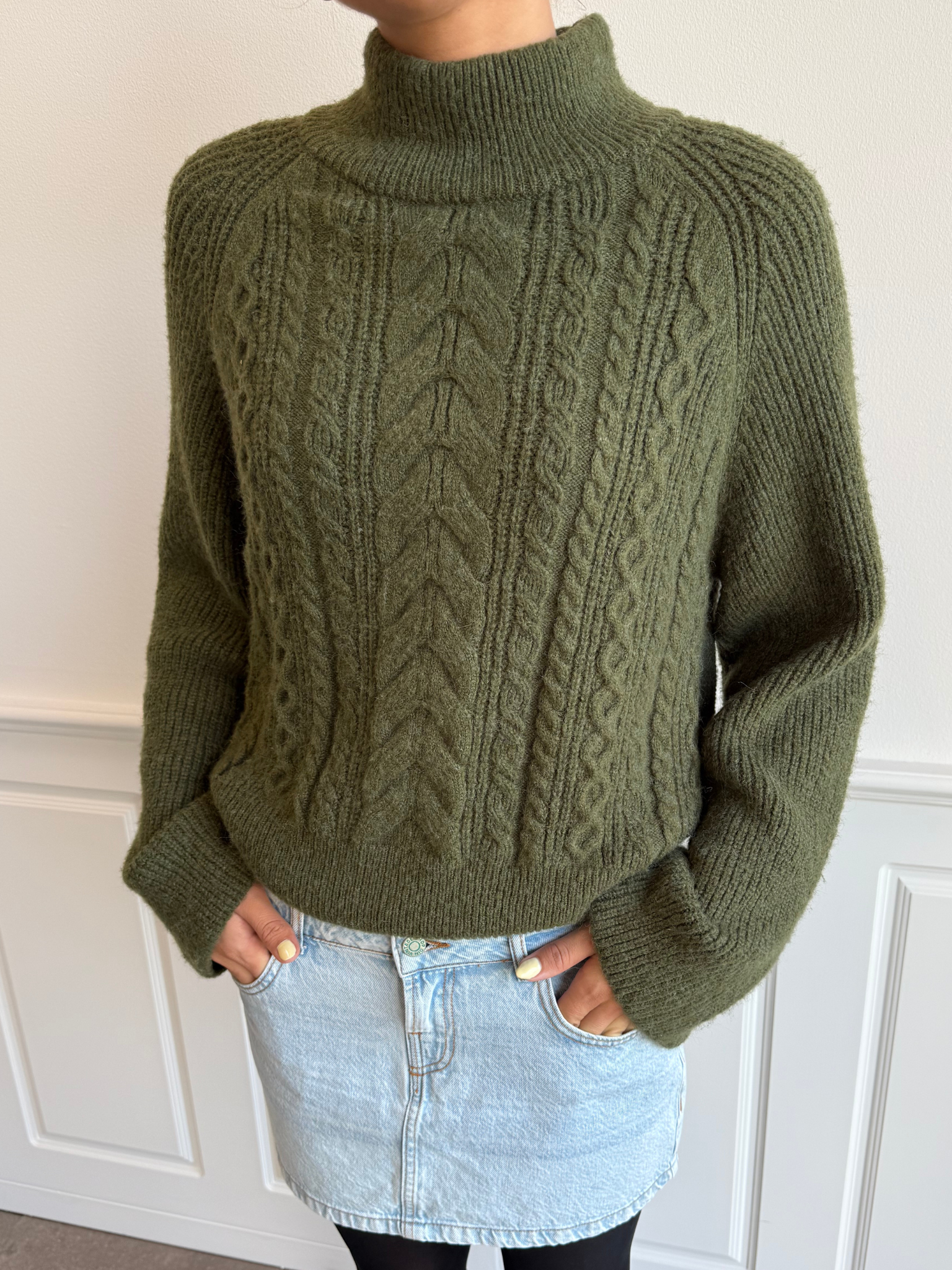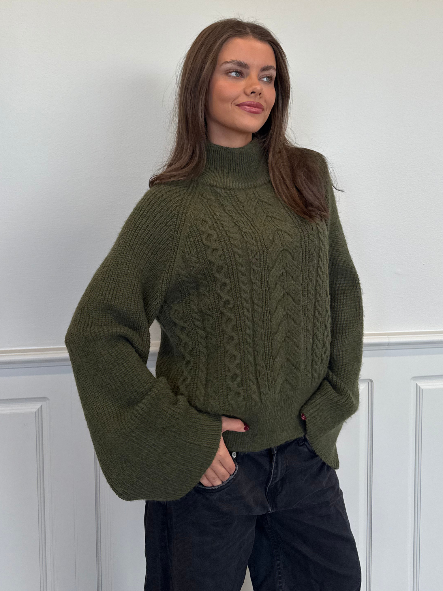 Lækker kabelstrikket strik med høj hals og super brede ærmer