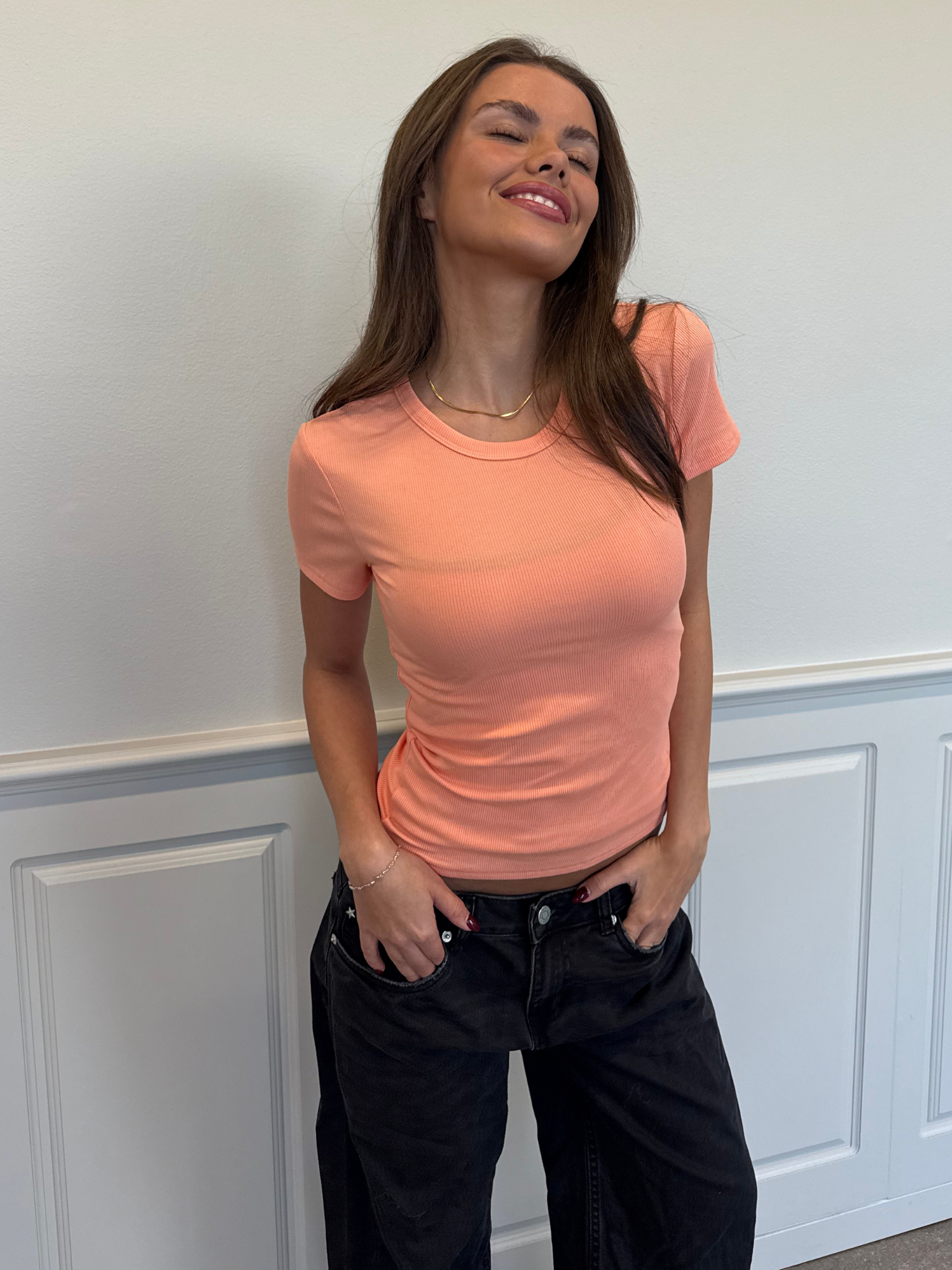 Sød tætsiddende t-shirt i ribbet kvalitet med rund hals og korte ærmer